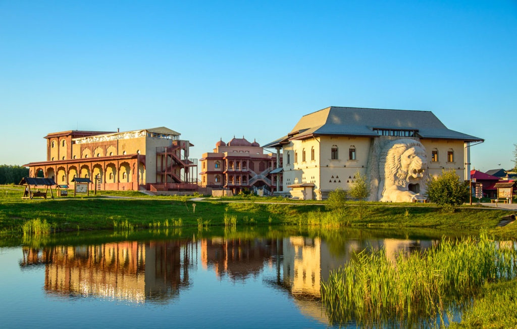 - Этноотель «Индия» – 36 двухместных номеров, оформленных в индийском могольском стиле. Размещение от 5000 р. за номер. В основе архитектурной концепции отеля «Индия» – крепостное сооружение в Агре Красный форт, благодаря чему постройка в ЭТНОМИРе выглядит такой аутентичной.