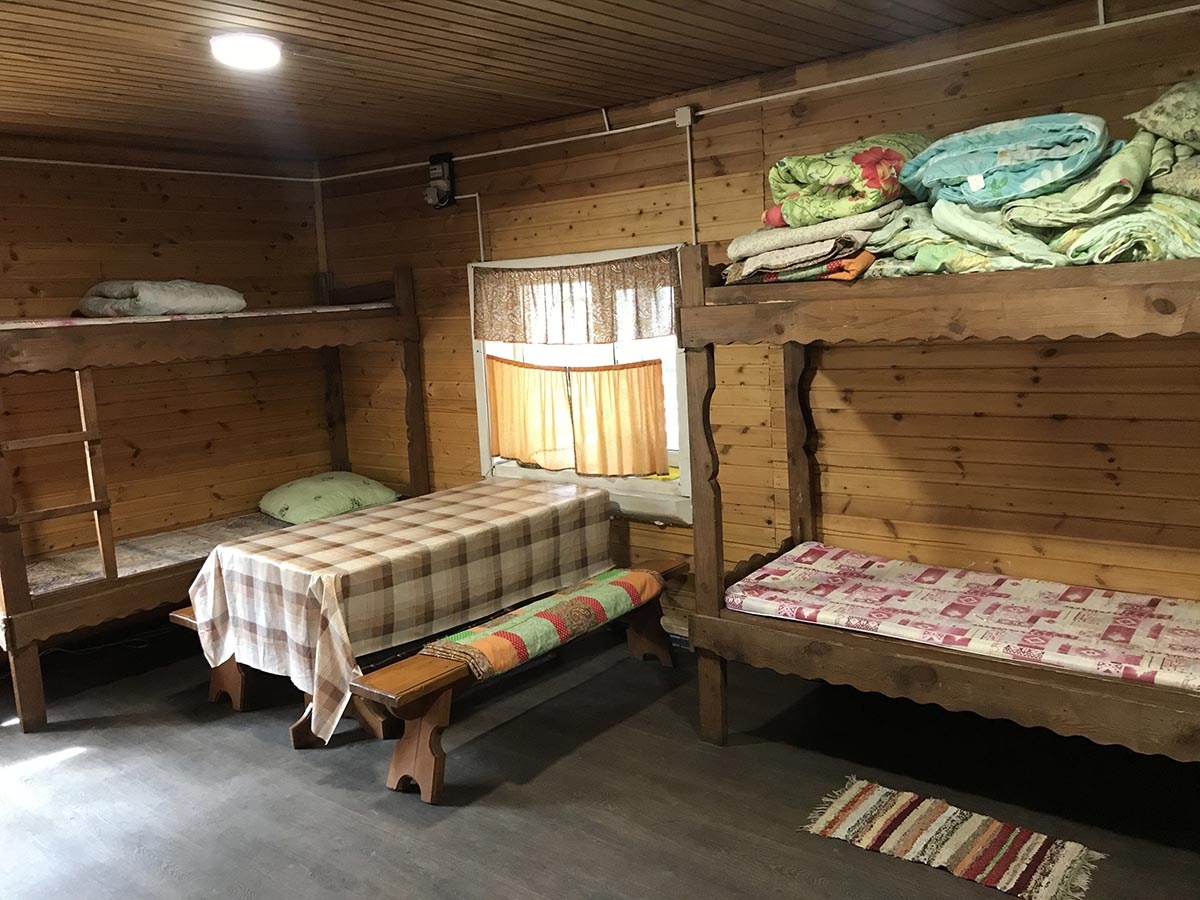Проживание: Одноэтажный деревянный дом на 6 мест и одноэтажный деревянный дом на 9 мест (3- и 6-местные комнаты).