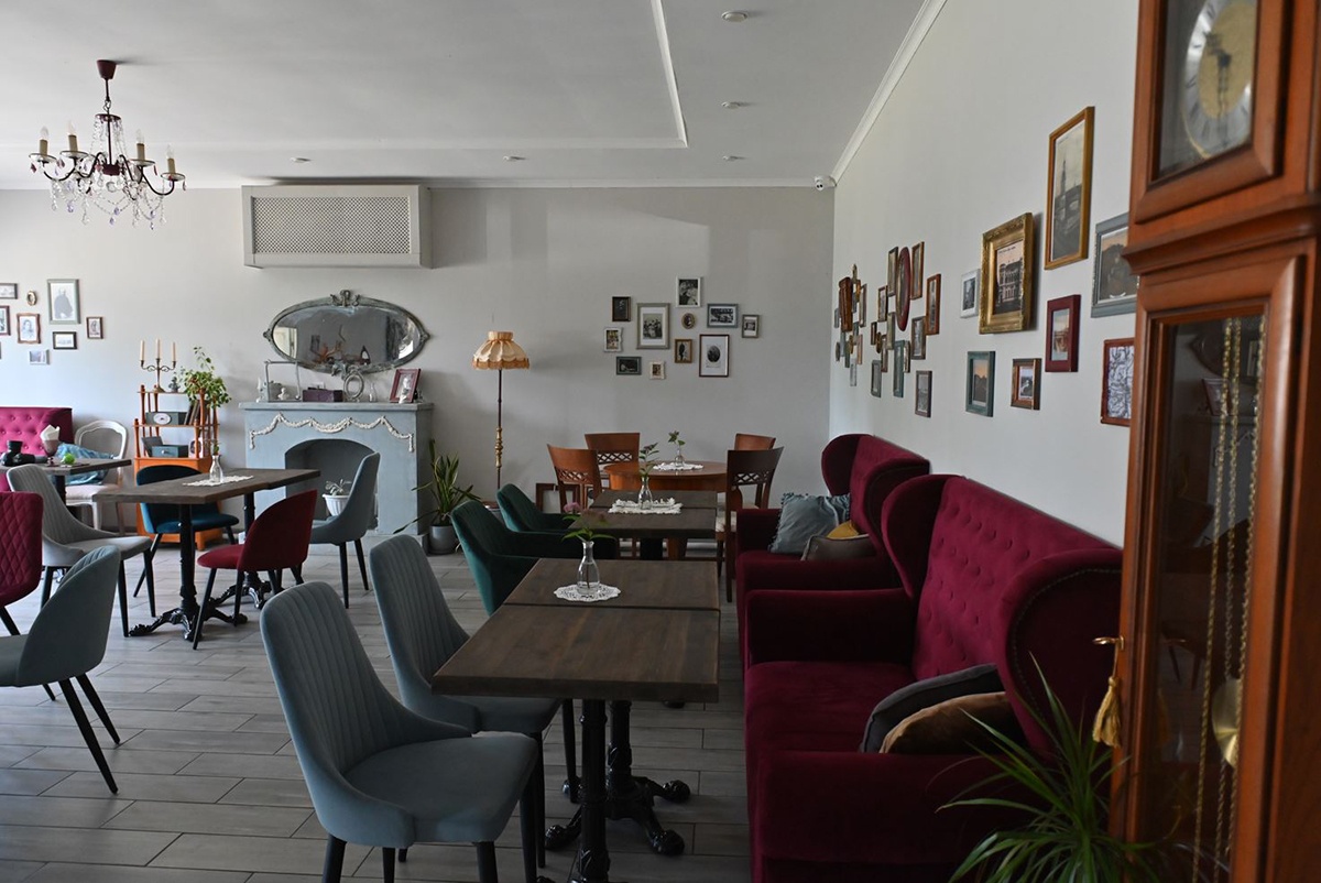 В кафе один большой и уютный зал, стилизованный под интерьер XIX века. Есть открытая веранда с видом на красивый городской сад и долину реки Жиздры. Есть небольшая библиотека, в которой представлены книги по русской литературе и искусству (в том числе раритетные издания), а также книги для детей. В основном зале играет классическая музыка известных композиторов.
