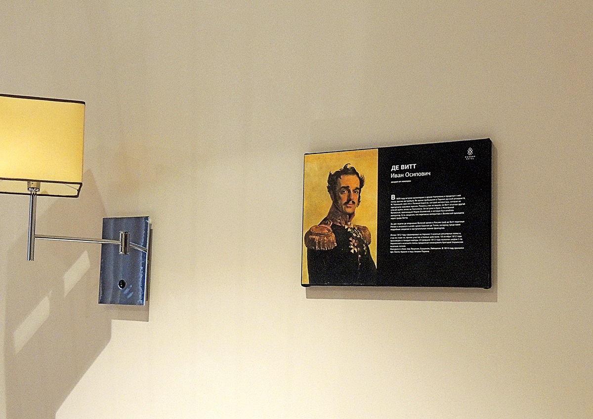 Уровень гостиницы – 4***. Номера четырех категорий: стандарт, люкс, полулюкс, апартаменты. Каждый номер посвящён одному из героев Отечественной войны 1812 года. Все номера вне зависимости от категорий оснащены системами автоматического пожаротушения и центрального кондиционирования, цифровой телефонной связью и минибаром, а также телевидением и доступом к беспроводному интернету.