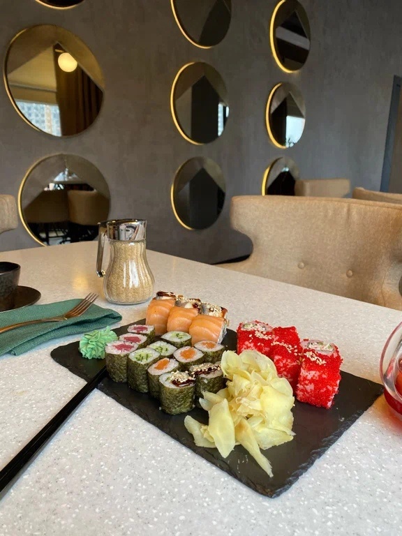 Здесь готовят классические блюда японской кухни: большой ассортимент суши, роллов разных видов (горячих, острых), сашими. Например, опалённые суши с трюфелем в трёх вариантах: лосось, тунец или гребешок. Супы: Мисо, Том Ям, Рамен и другие. В паназиатском стиле лапша, жареный рис, гедза. Конечно, много рыбных блюд и блюд с морепродуктами.