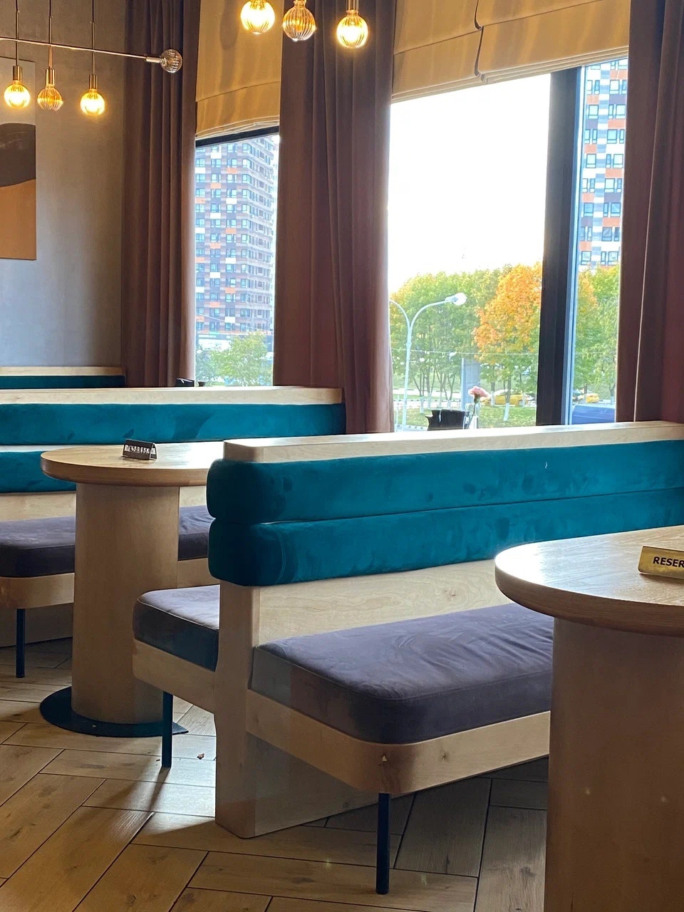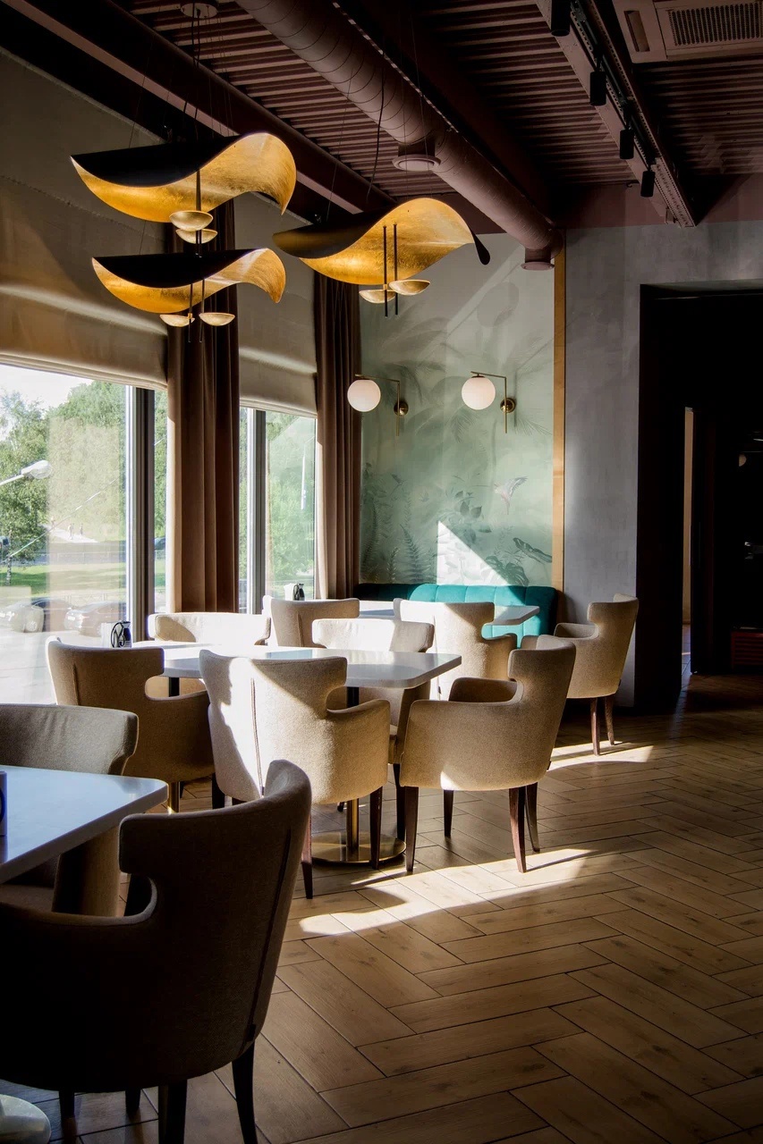 Панорамные окна выходят на современный жилой комплекс "Московский квартал". Ресторан находится недалеко от усадьбы Белкино и от музея "Судьба солдата".