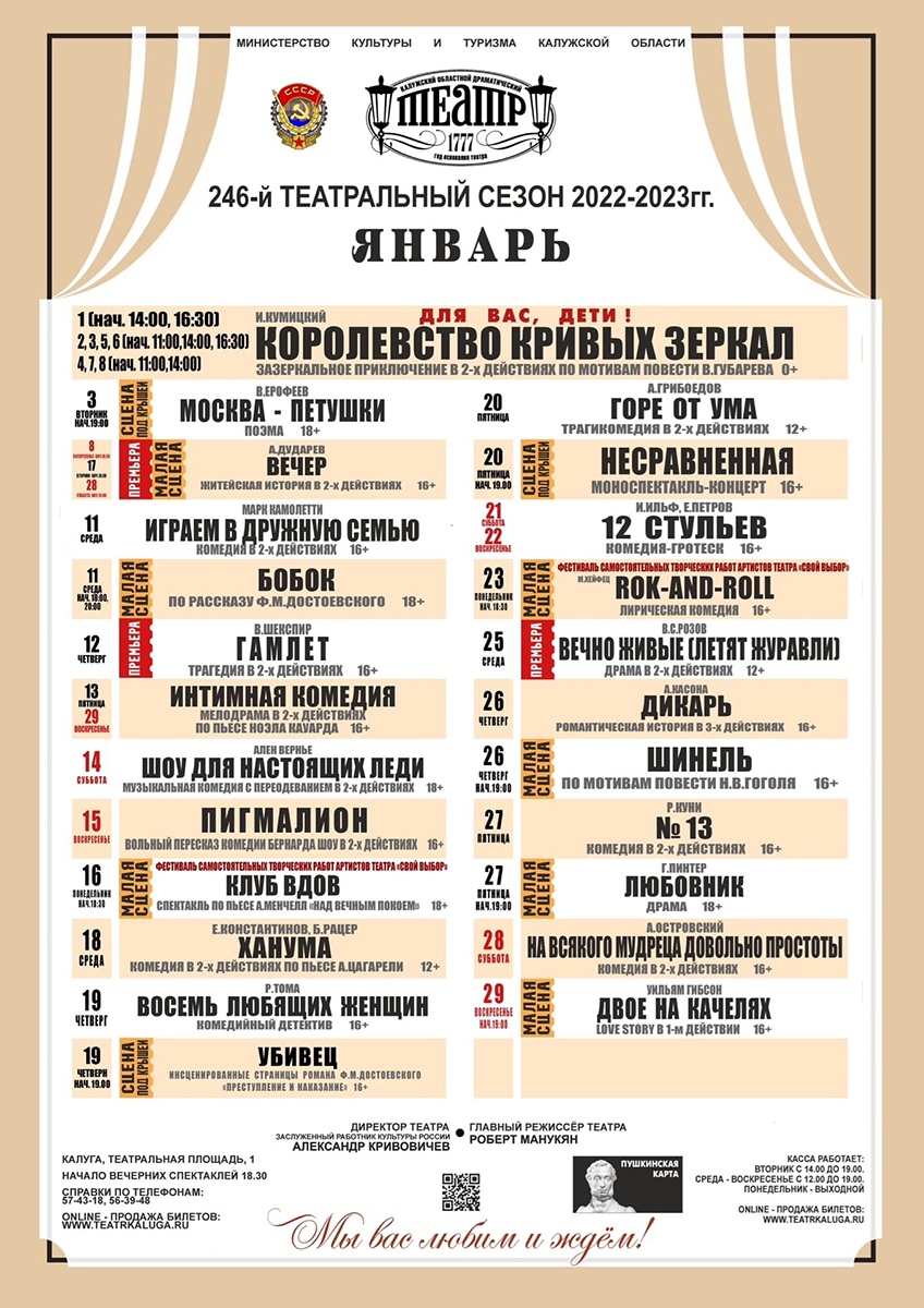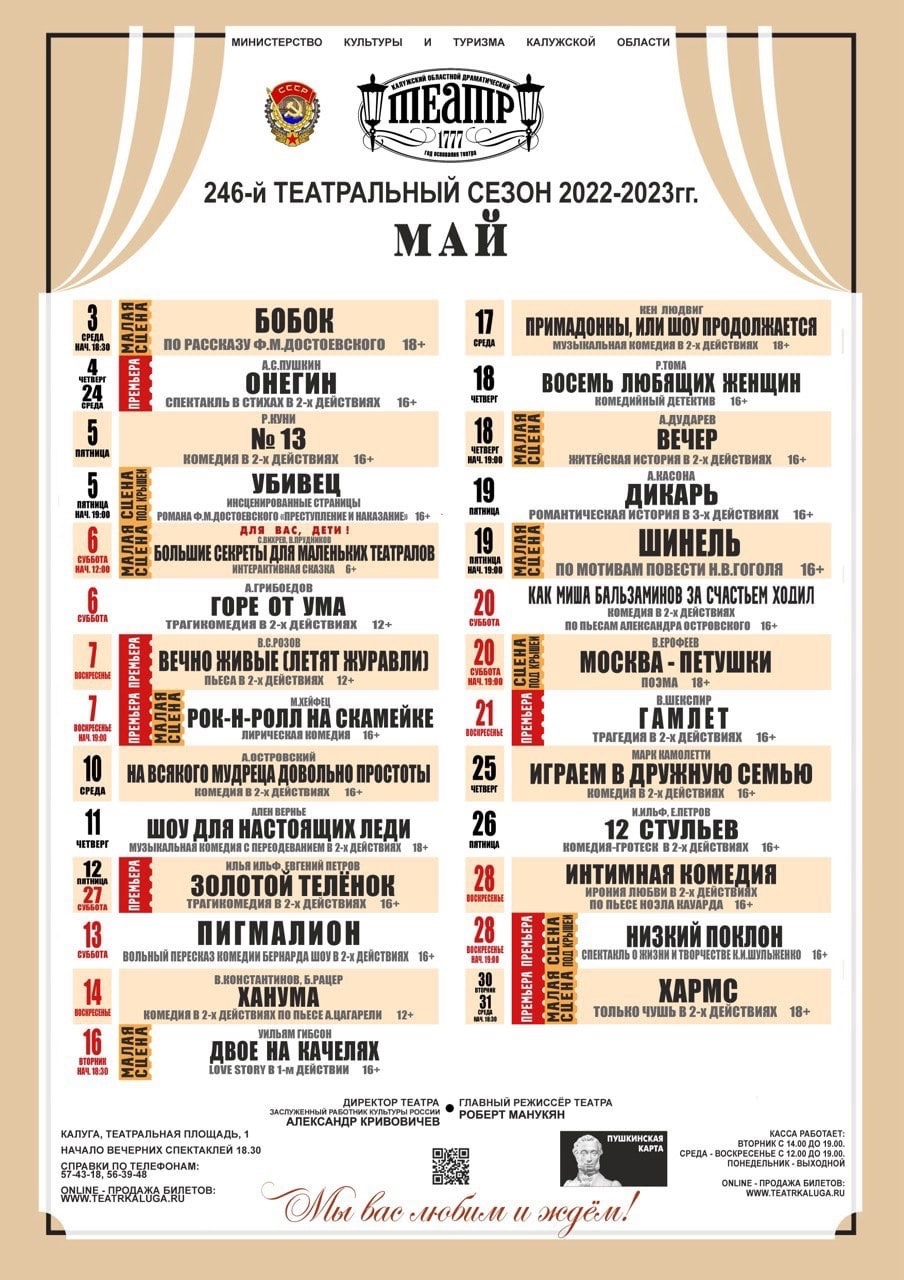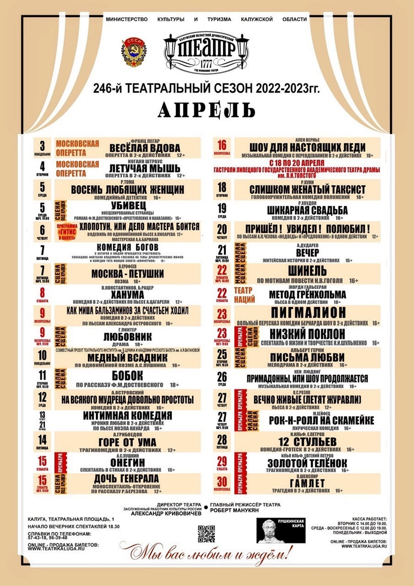 - 23 апреля Сцена под крышей станет местом первого показа авторской постановки актрисы калужского драмтеатра Ирины Бургоновой, созданной в рамках 3-го фестиваля самостоятельных работ артистов театра – стипендиатов Союза театральных деятелей России. Моноспектакль "Низкий поклон" посвящён жизни и творческой деятельности Клавдии Шульженко. Возрастное ограничение: 12+. Повтор постановки состоится 28 мая.