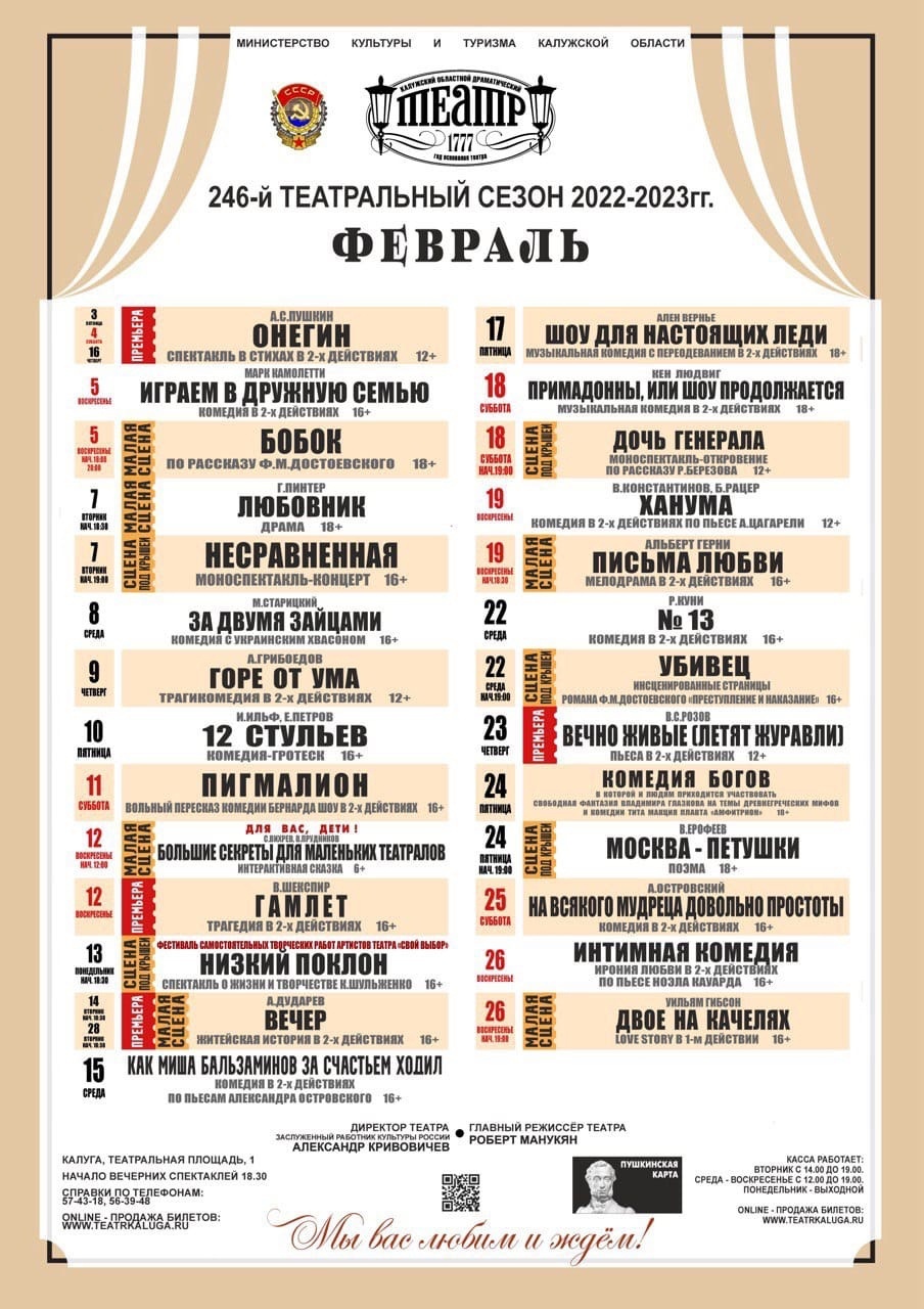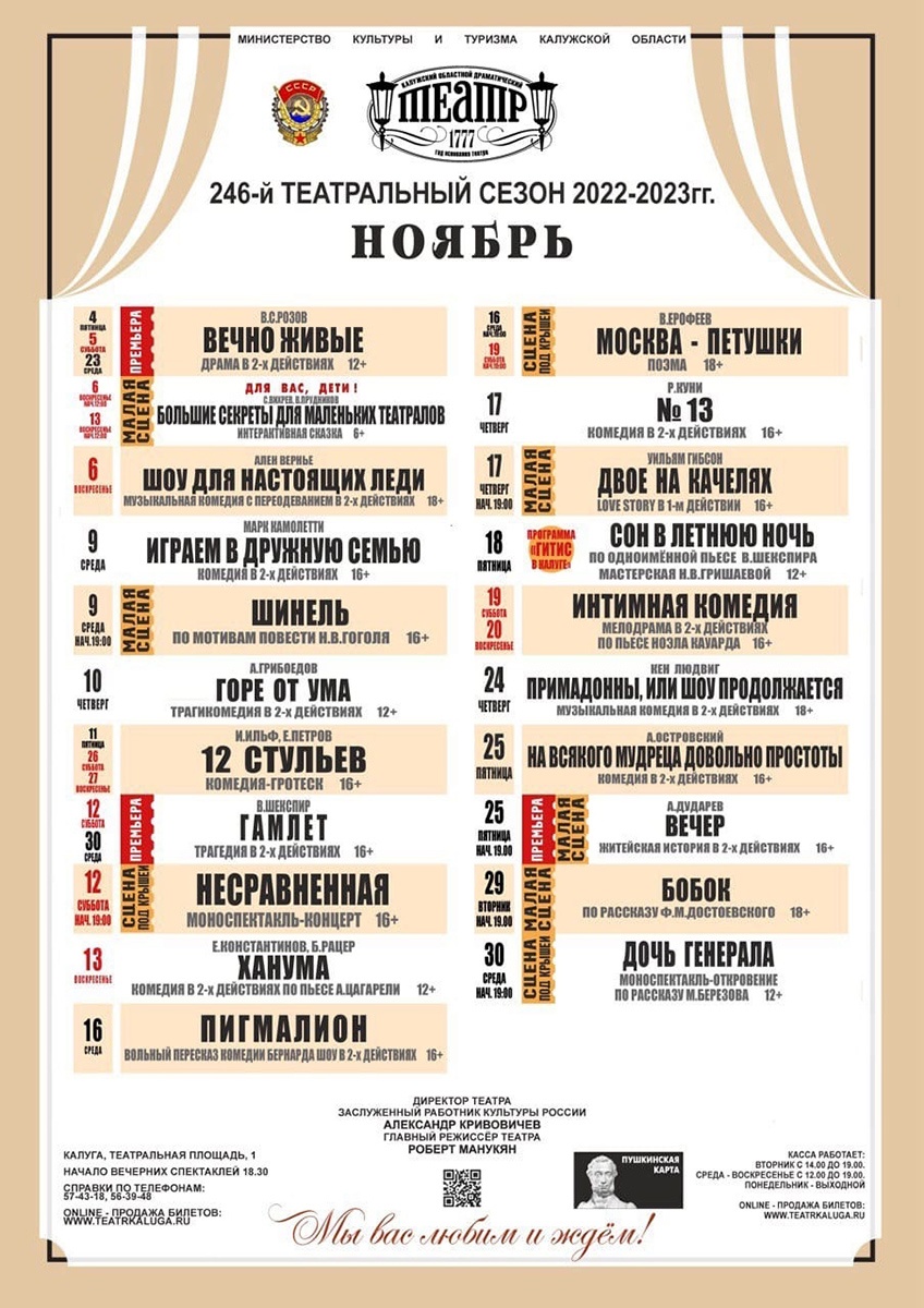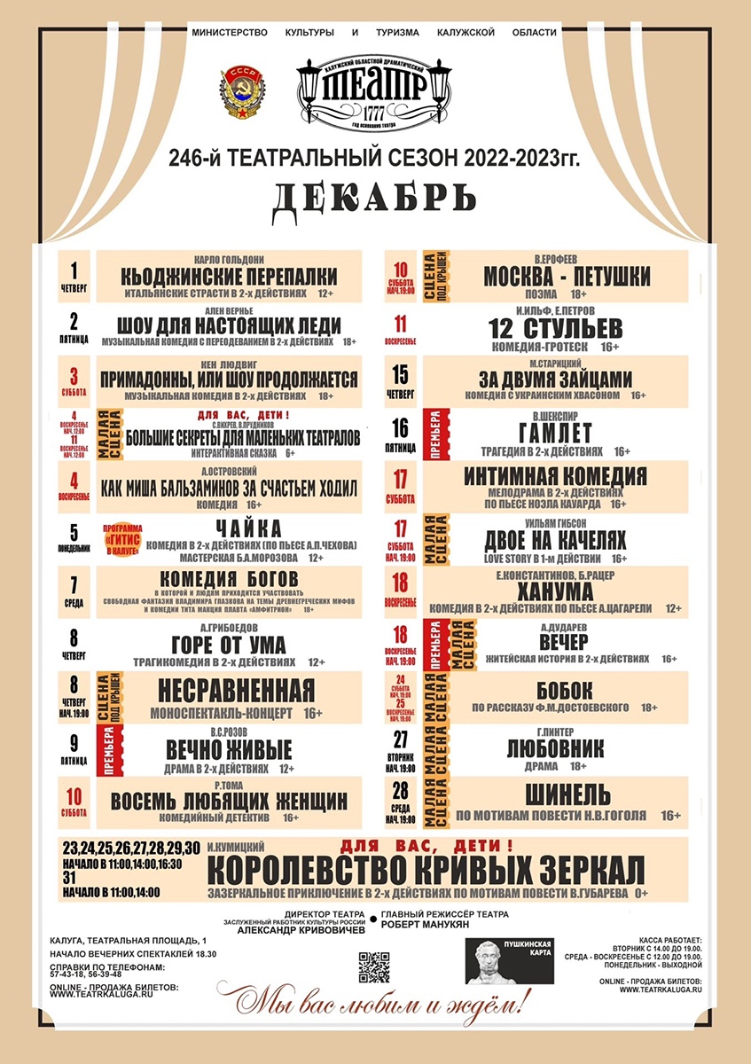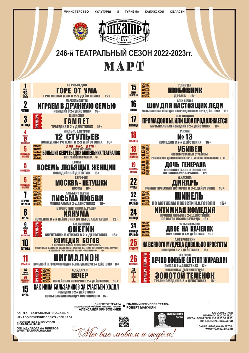 - 23 апреля Сцена под крышей станет местом первого показа авторской постановки актрисы калужского драмтеатра Ирины Бургоновой, созданной в рамках 3-го фестиваля самостоятельных работ артистов театра – стипендиатов Союза театральных деятелей России. Моноспектакль "Низкий поклон" посвящён жизни и творческой деятельности Клавдии Шульженко. Возрастное ограничение: 12+. Повтор постановки состоится 28 мая.