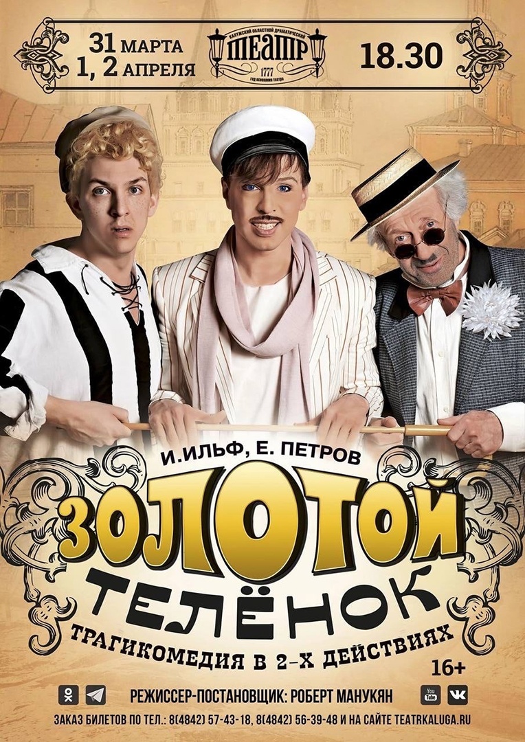 - 31 марта посетители впервые увидят калужскую постановку по одноименному роману Ильи Ильфа и Евгения Петрова, который является продолжением романа «12 стульев» – «Золотой теленок».
