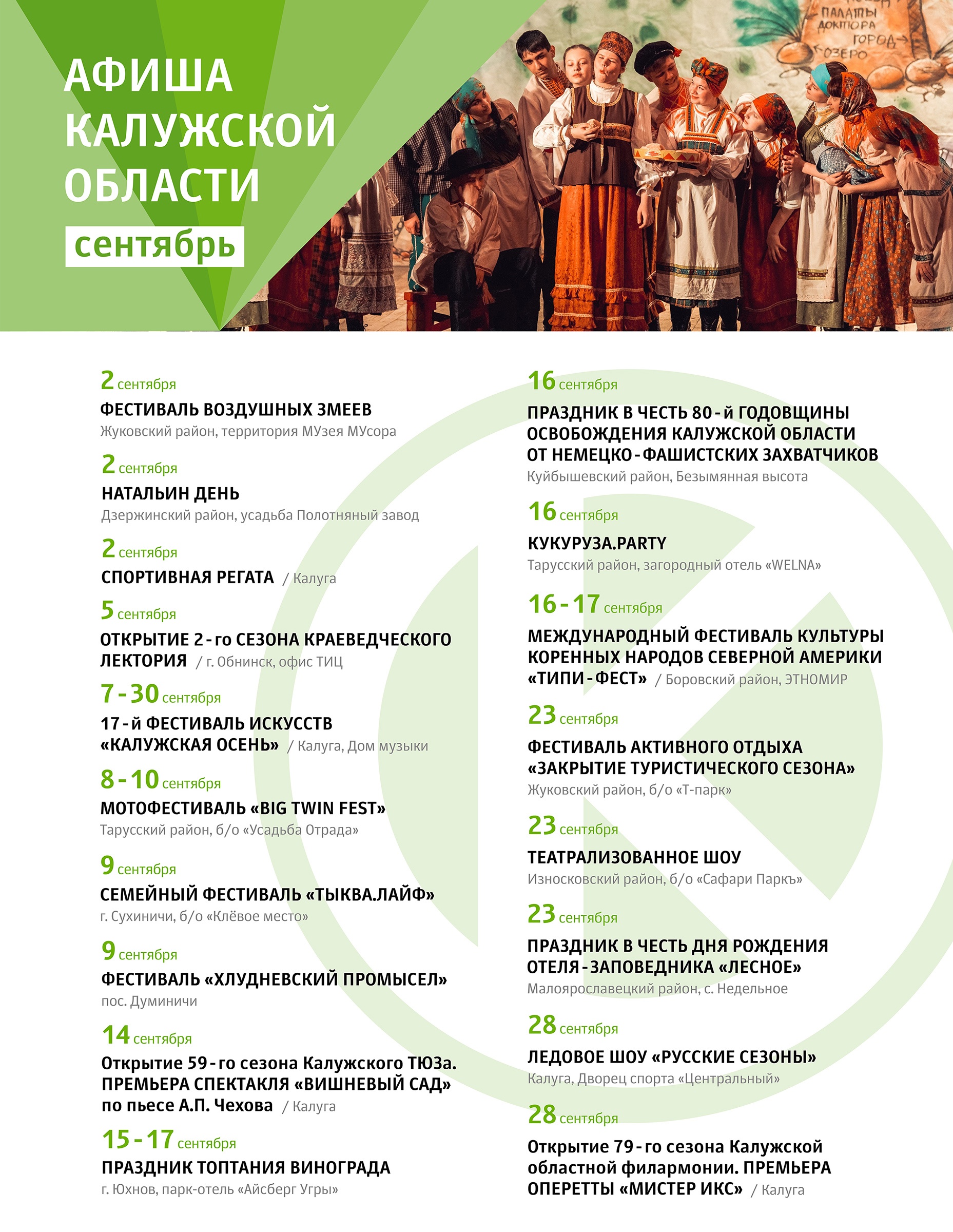 - 9 сентября – семейный фестиваль "Тыква.лайф", г. Сухиничи, б/о "Клёвое место" – в рамках проекта "Сельское лето"
