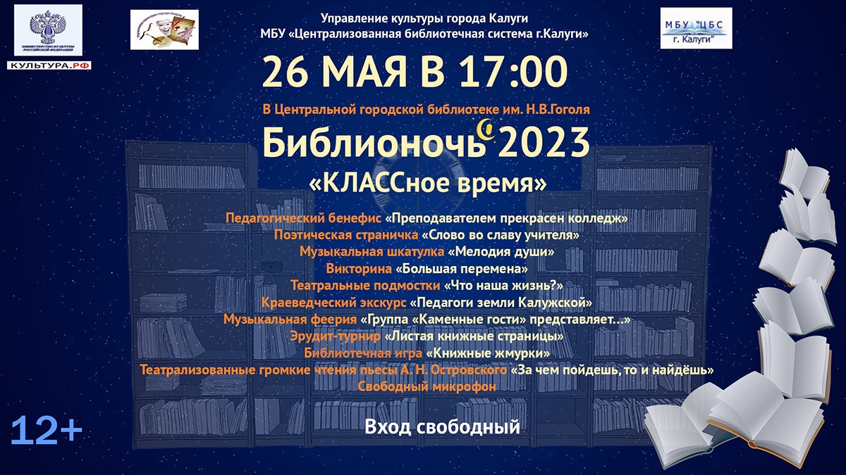 В Центральной городской библиотеке им. Н.В. Гоголя (ул. Ленина, 66) в праздничном действии «КЛАССное время» будет представлена музыкальная шкатулка «Мелодия души» (студенты I курса Калужского областного музыкального колледжа культуры им. С.И. Танеева), педагогический бенефис «Преподавателями прекрасен колледж» (преподаватели и студенты Калужского областного колледжа культуры и искусств). Студенты Калужского колледжа культуры представят поэтическую страницу «Слово во славу учителя». Постоянные участники акции группа «Каменные гости» МЭШДОМа выступят с музыкальной феерией «Группа «Каменные гости» представляет…». Настоящим украшением праздника станет участие артистов Калужского театра кукол. На импровизированных театральных подмостках будут представлены зарисовки «Что наша жизнь?» и театрализованные громкие чтения пьесы А.Н. Островского «За чем пойдешь, то и найдешь» (сотрудники ЦГБ им. Н.В. Гоголя). Гости праздника станут участниками игр, викторин, эрудит-турнира, краеведческого экскурса «Педагоги Земли Калужской». По окончании мероприятия гостей праздника ждет зажигательное шоу «Школьная дискотека».