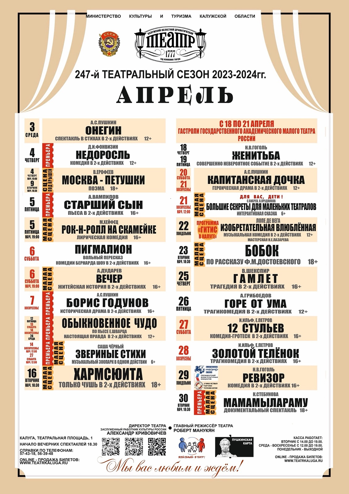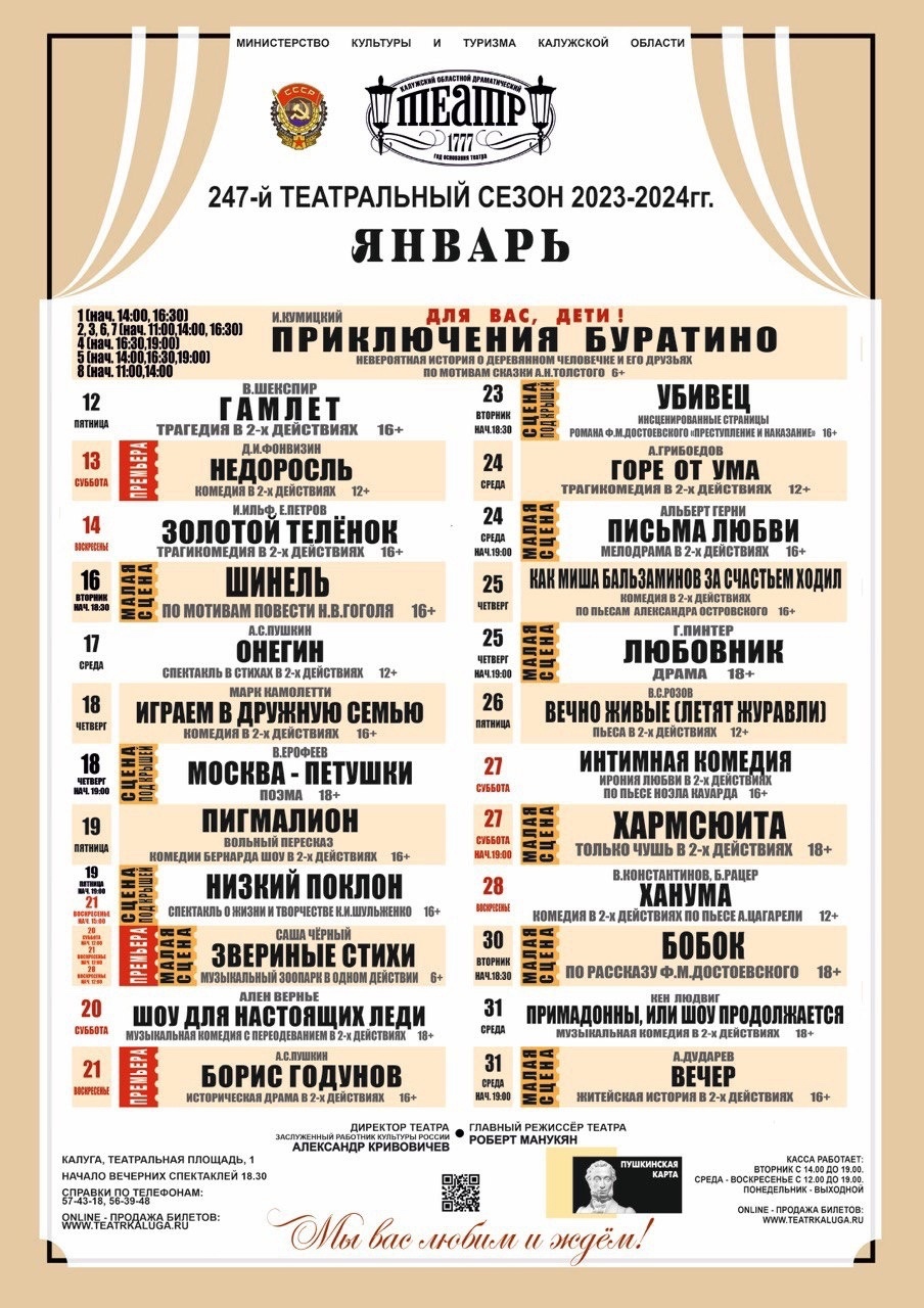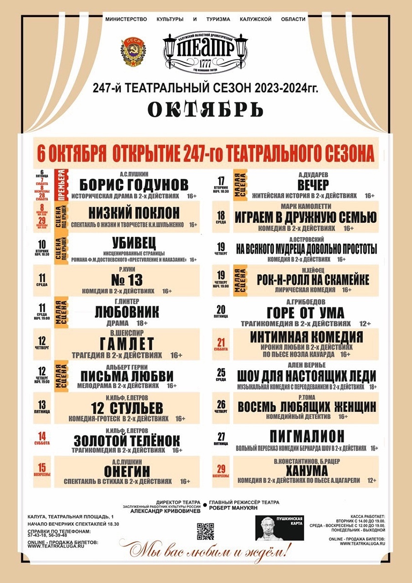 247-й сезон Калужского драматического театра откроется 6 октября премьерой исторической драмы «Борис Годунов» А.С. Пушкина.
