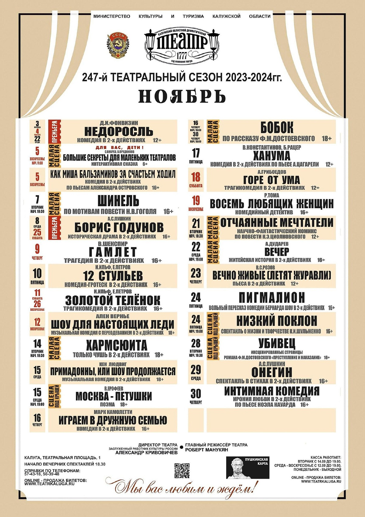 - 3 и 4 ноября очередная премьера – и вновь классика. На этот раз комедия Д.И. Фонвизина «Недоросль». Это история о семье Простаковых, где каждый переживает свою драму и борется за счастье. Главный герой, недоросль Митрофан, становится символом безнравственности и лени, а его мать, г-жа Простакова, представляет собой образ деспотичной и жестокой женщины. В то же время в пьесе есть и положительные герои – Софья, Милон и Пx;">равдин, которые олицетворяют честность, доброту и справедливость. Приходите на спектакль «Недоросль», чтобы понять, что проблемы, затронутые в пьесе, актуальны и сегодня. Режиссёр-постановщик: Кирилл Солёнов. Показ новой постановки состоится также 22 ноября, 16 декабря, 13 января, 3 февраля, 1 марта, 4 апреля, 22 мая.