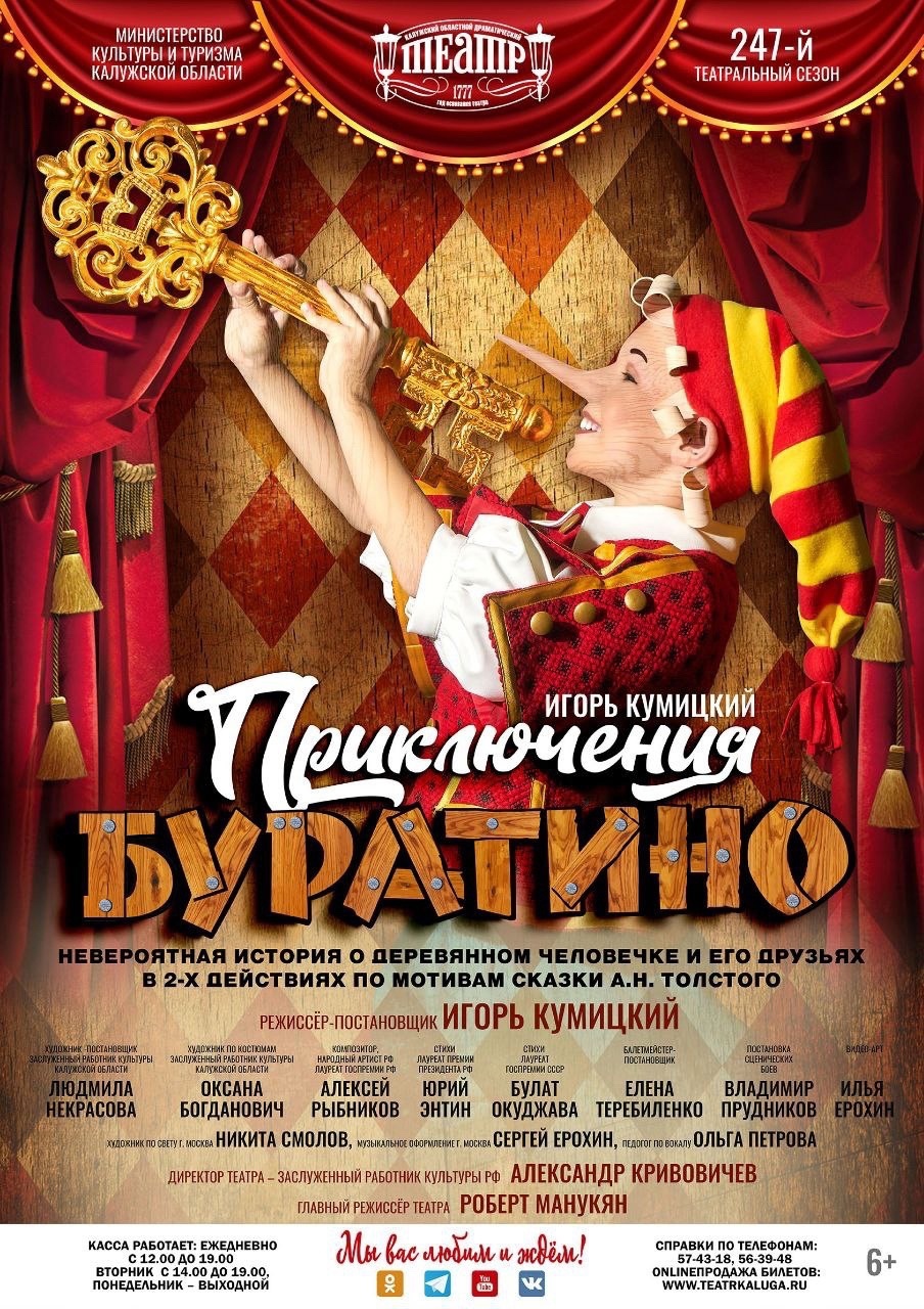 - К Новому году труппа готовит «невероятную историю о деревянном человечке и его друзьях в 2-х действиях по мотивам сказки А.Н. Толстого» – конечно, это «Приключения Буратино»! Показы сказки пройдут 22, 23, 24, 30 и 31 декабря, а также ежедневно с 1 по 8 января.