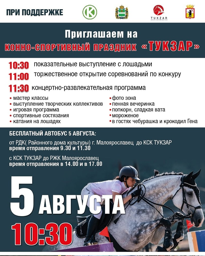 Конно-спортивный клуб «Тукзар» в Малоярославецком районе в рамках регионального событийного проекта «Сельское лето» 5 августа устраивает праздник. Гости Тукзара смогут наблюдать соревнования по конкуру.