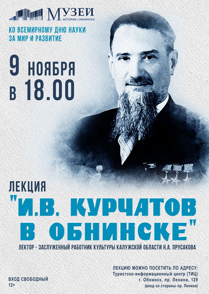 9 ноября в 18:00 – И.В. Курчатов в Обнинске. Лектор – Прусакова Н.А., заведующая отделом истории Музея истории города Обнинска.