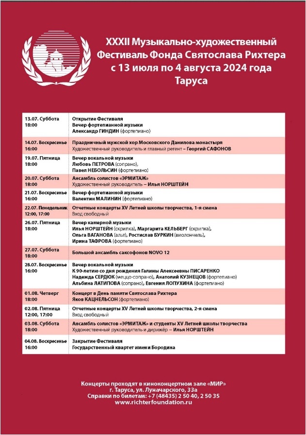 Пианист Святослав Рихтер каждое лето проводил в своём доме на берегу Оки в Тарусе. Он считал это место превосходным для творчества. С 1993 года каждое лето почитатели таланта великого музыканта собираются со всех уголков страны – на музыкально-художественный фестиваль, основанный маэстро. В 2023 году классические концерты и другие мероприятия в рамках фестиваля пройдут в Тарусе с 13 июля по 4 августа.