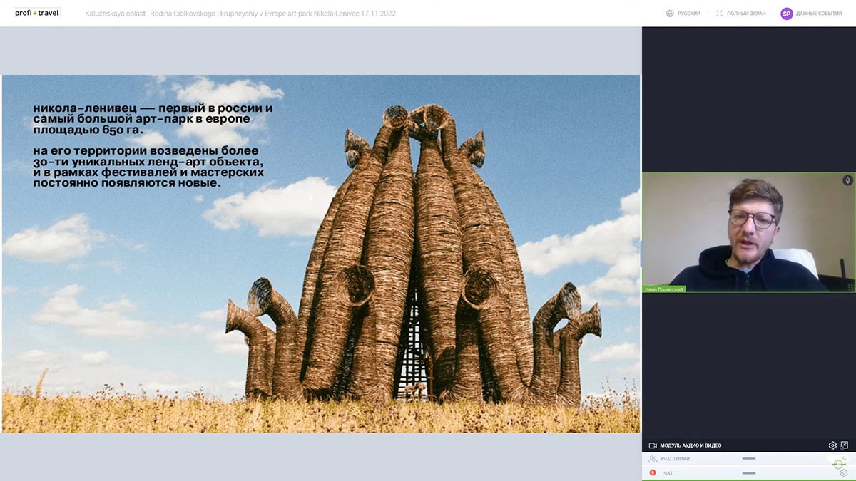 Агентством по развитию туризма Калужской области подготовлен региональный стенд, который знакомит с теми достопримечательностями и направлениями, которые могут привлечь отдыхающих из ближнего зарубежья. Соэкспонентами на выставке стали Государственный музей истории космонавтики, парк-музей «ЭТНОМИР» и арт-парк «Никола-Ленивец». 17 ноября представители этих туристических организаций приняли участие в онлайн-трансляции, где за час постарались сформировать устойчивый интерес к Калужской области у профессионалов туриндустрии других стран.
