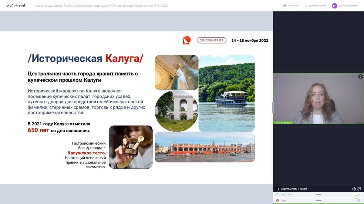Агентство по развитию туризма Калужской области и представители туриндустрии региона принимают участие в международной онлайн-выставке Russian Expo Days CIS Countries 2022 для профессионалов в сфере туризма из Азербайджанской Республики, Республик Беларусь, Казахстан и Узбекистан. Мероприятие проходит с 16 по 24 ноября при поддержке Российского союза туриндустрии.