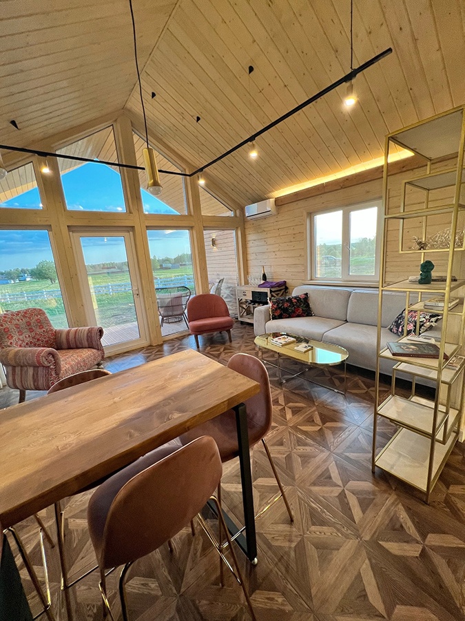 Гостей ждут комфортные барнхаусы с панорамными окнами, ужины в стейкхаусе «Быки и Булки» из органических продуктов и множество развлечений: прогулки по живописным пастбищам, конный клуб, мини-зоопарк, сауна с купелью и спа.