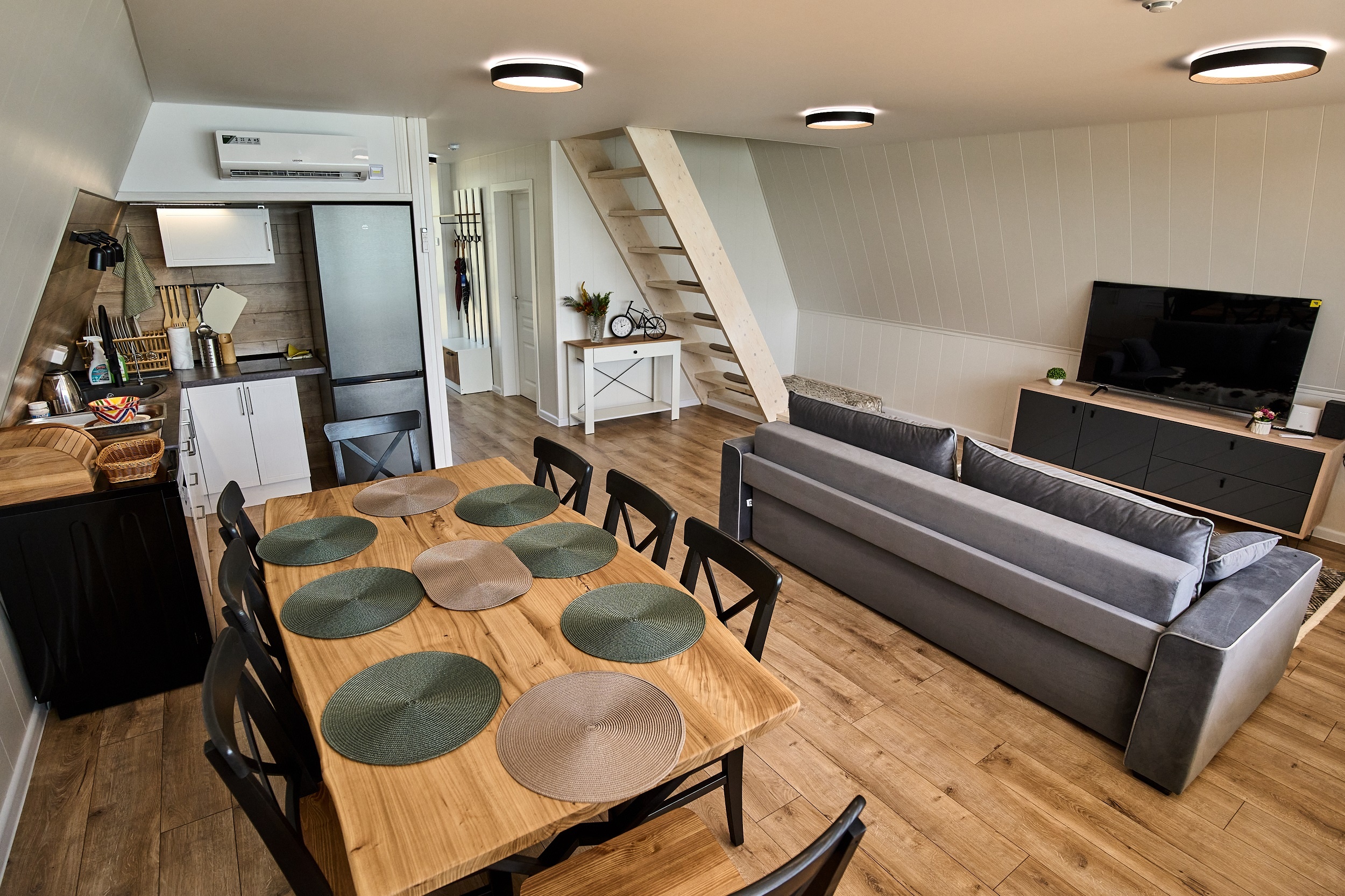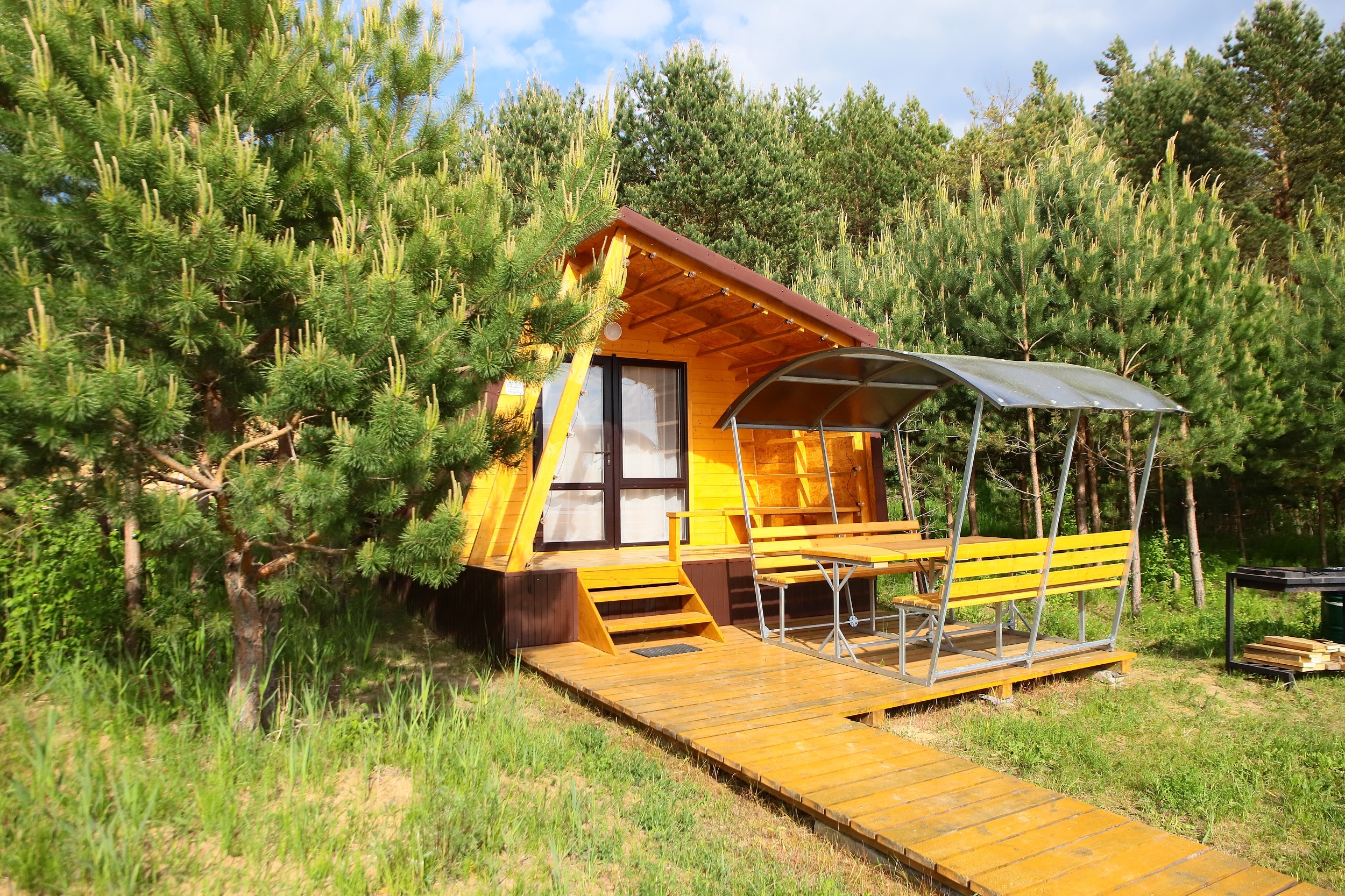 4 двухместных домика - рассчитаны на 8 чел. С удобствами, ТВ, диван, холодильник, электричество, отопление, душевая. Есть оборудованная кухня, возможно самостоятельное приготовление пищи