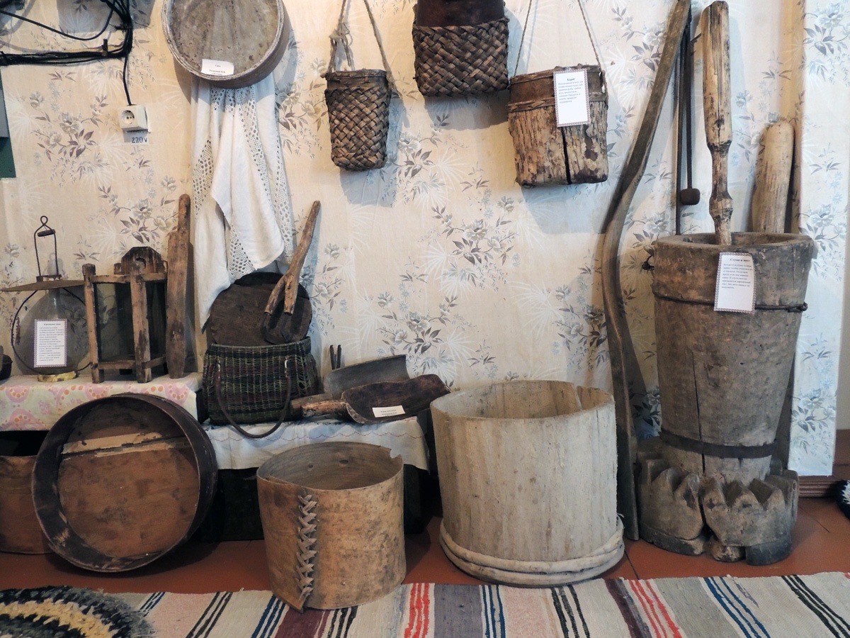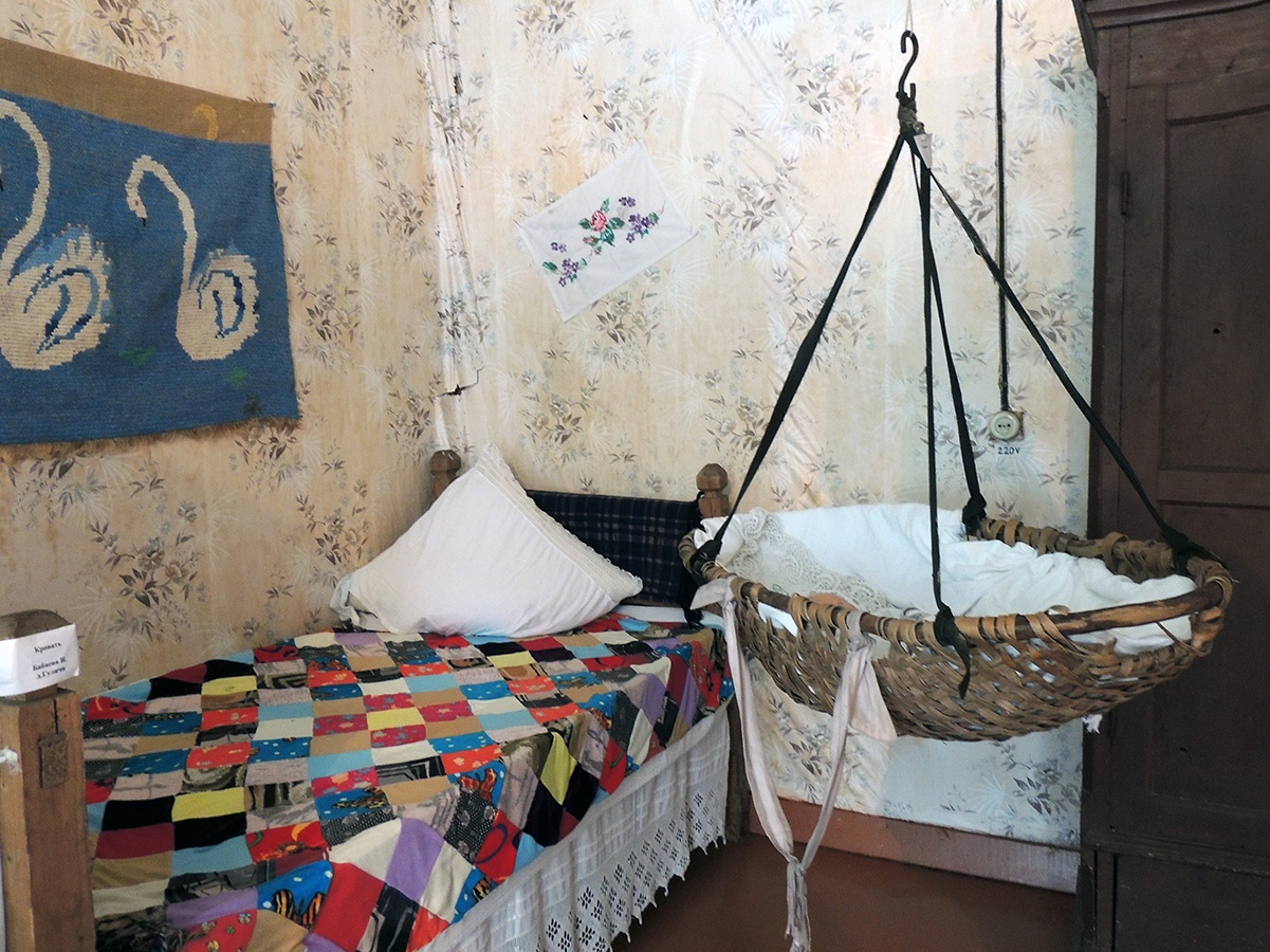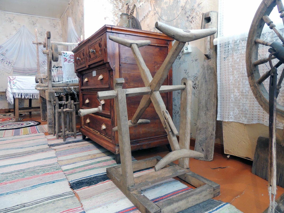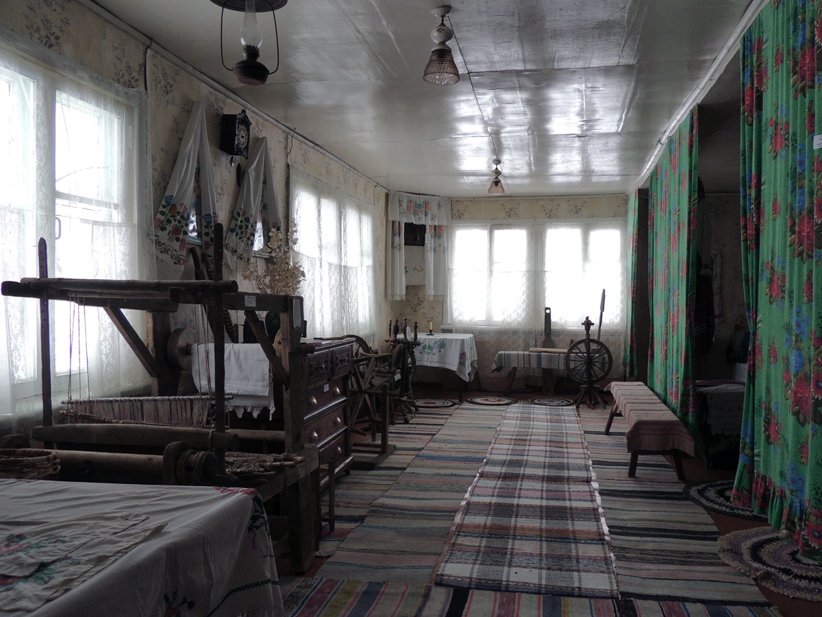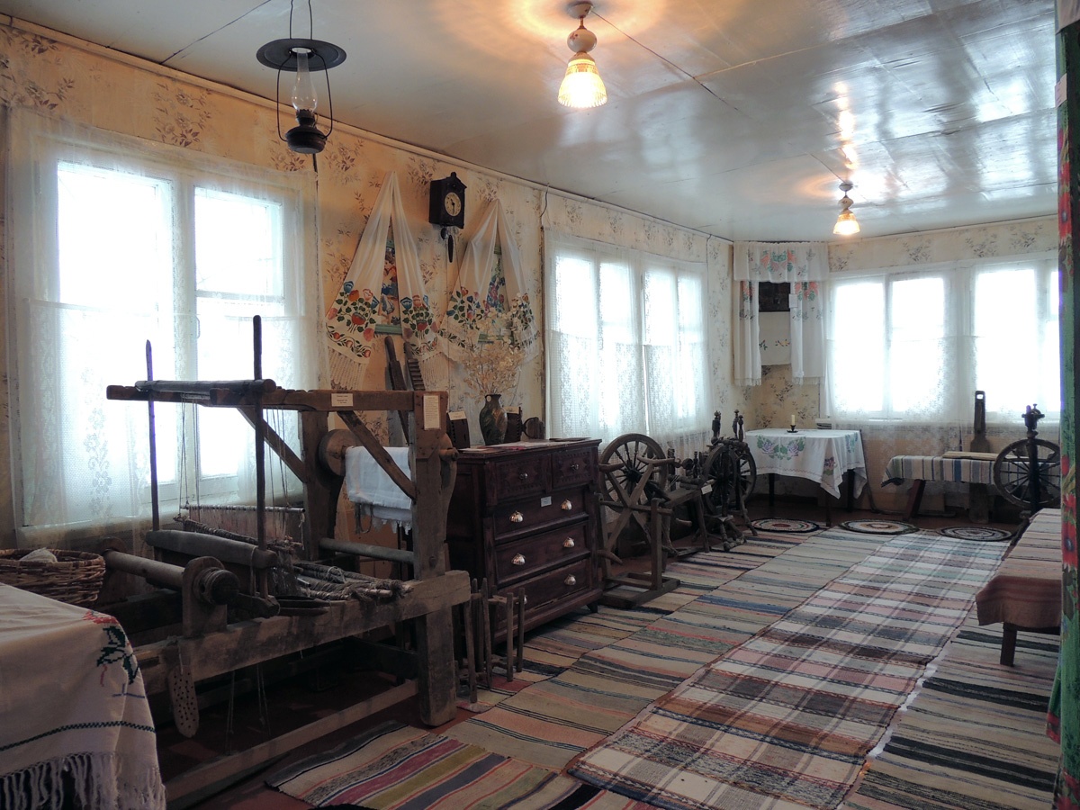 При входе в избу справа располагается рабочее место хозяйки с русской печью, где все предназначено для приготовления пищи и ведения хозяйства. Напротив находится рабочее место хозяина, где он в зимнее время работал: чинил, сапожничал, мастерил что-нибудь. Красный угол с иконами, вышитые скатерти, рушники и полотенца хранят дух и традиции поколений. Значительное место в избе занимал деревянный ткацкий стан-кросно, на нем женщины ткали в долгие зимние вечера. На пол стелили половики, дорожки или самотканые ковры. По-крестьянски убранные кровати, детская люлька, сундуки с приданым. Это не просто предметы, имеющие этнографическую ценность, — в них отражена мудрость народная и картина мира людей прошлого.
