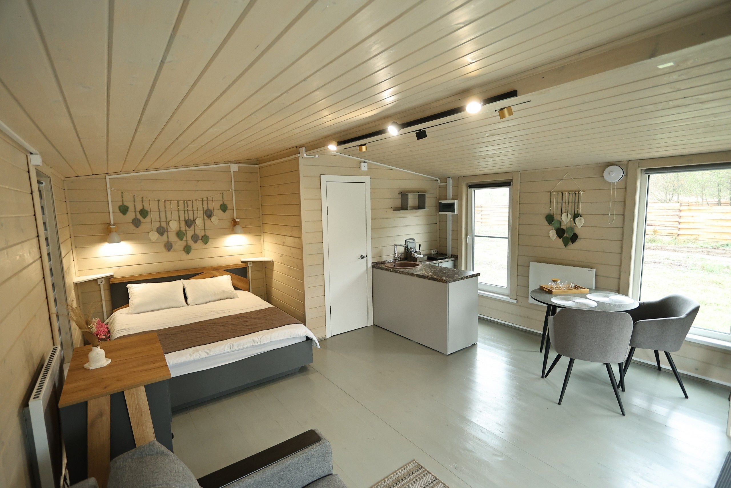 Стоимость размещения в сутки: аренда домика от 7 500 руб./сутки за двоих человек. Дополнительное место - 1 000 руб./сутки. Скидка для детей до 7 лет - 50% С собакой до 35 см - 1 000 руб.