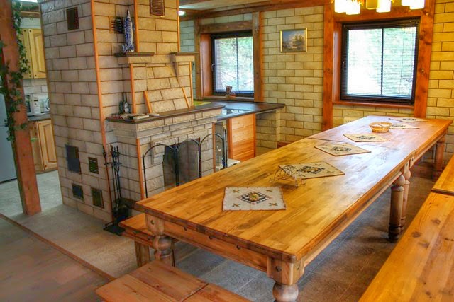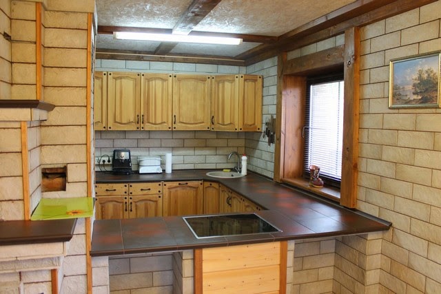 Питание: В коттедже есть оборудованная кухня. При входе есть также летняя кухня с большим столом и всем необходимым для приготовления любых блюд на открытом огне (вертел, казан, мангал, гриль, коптильня).