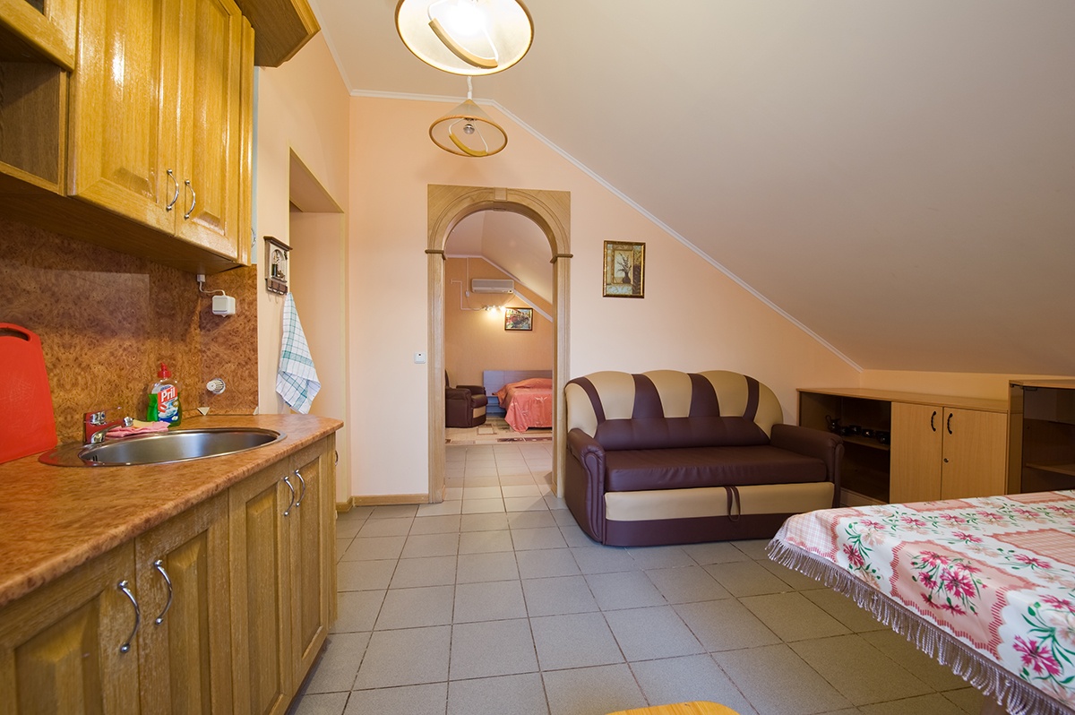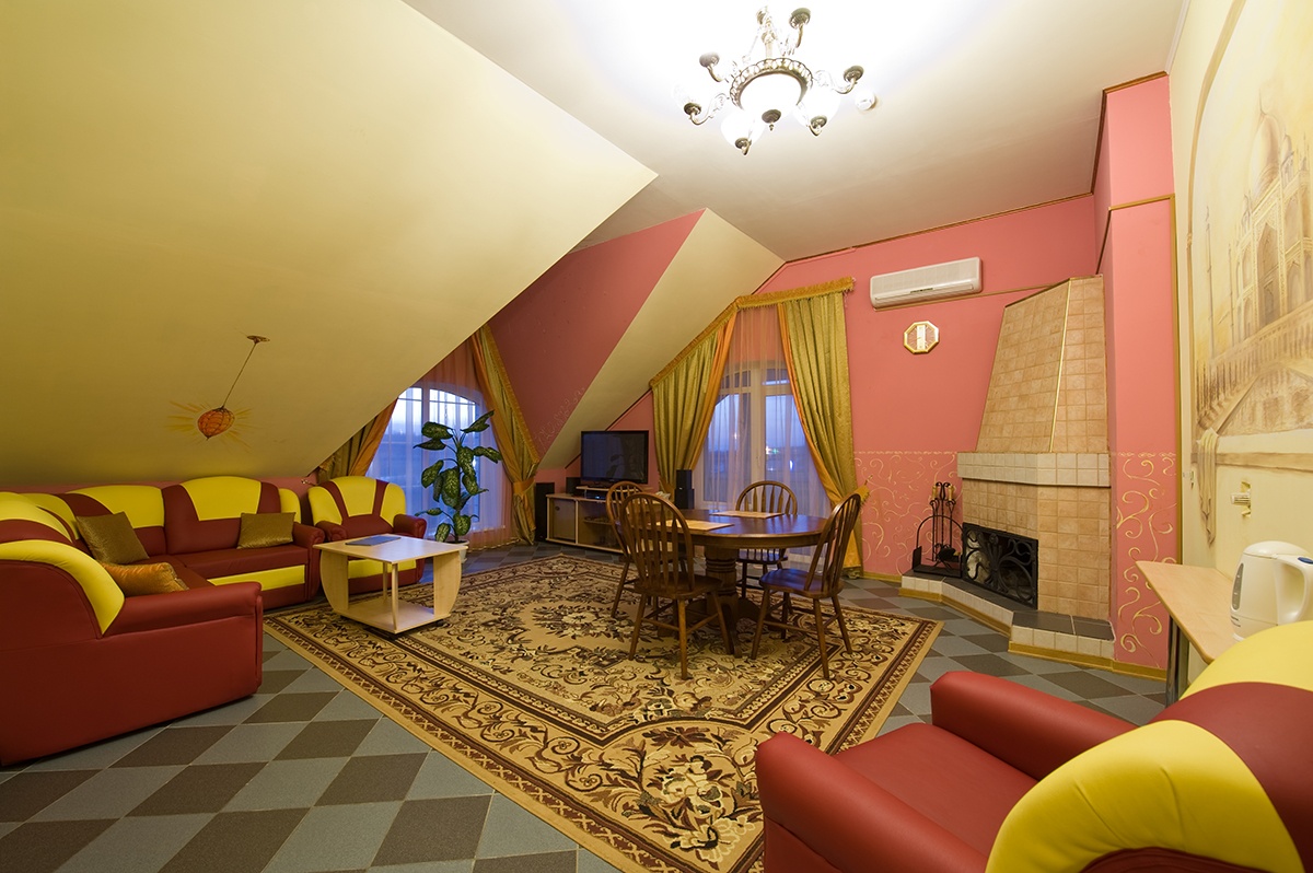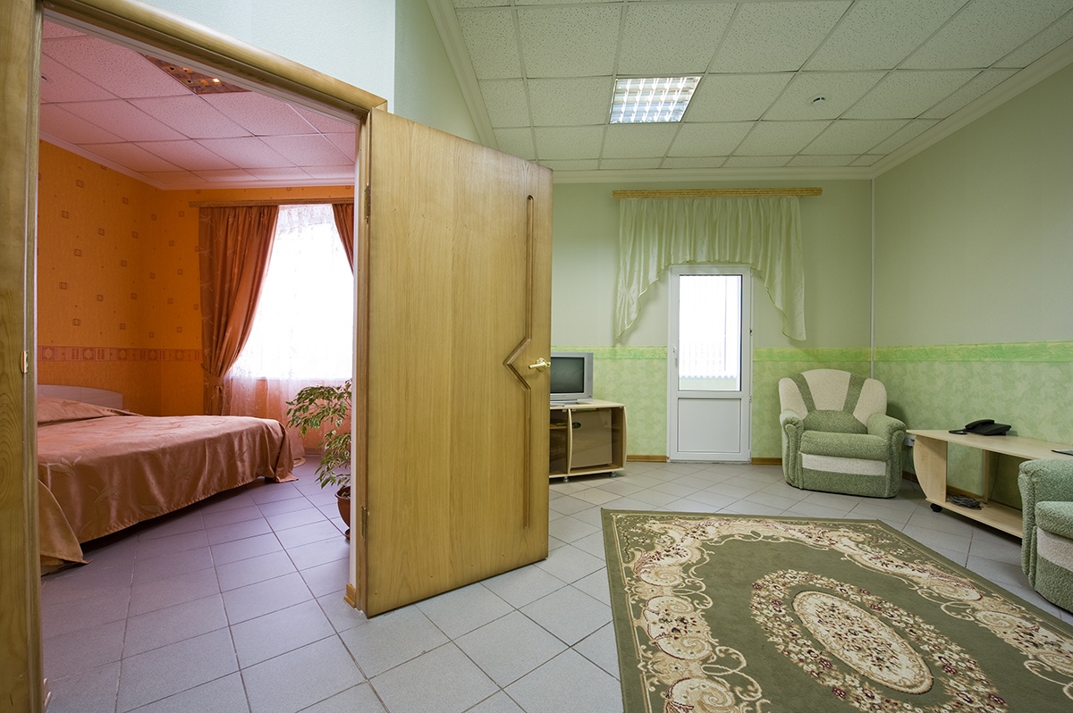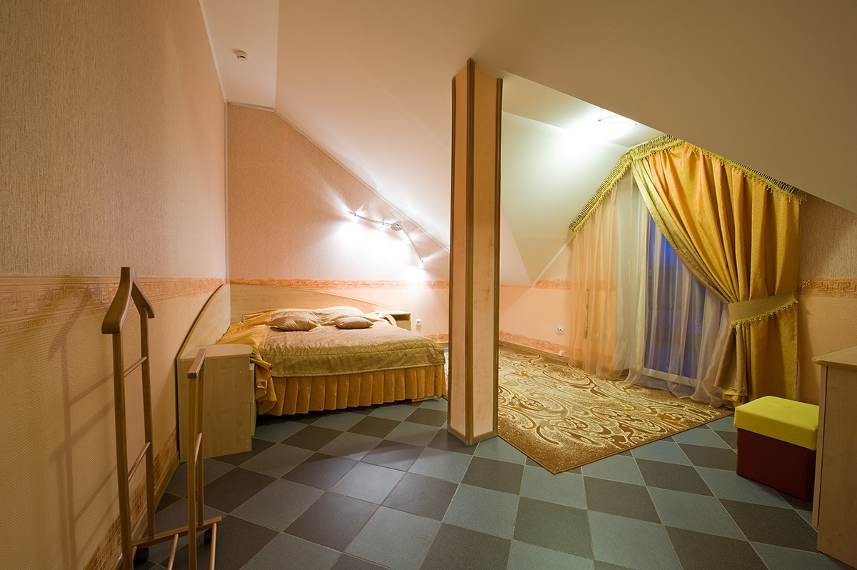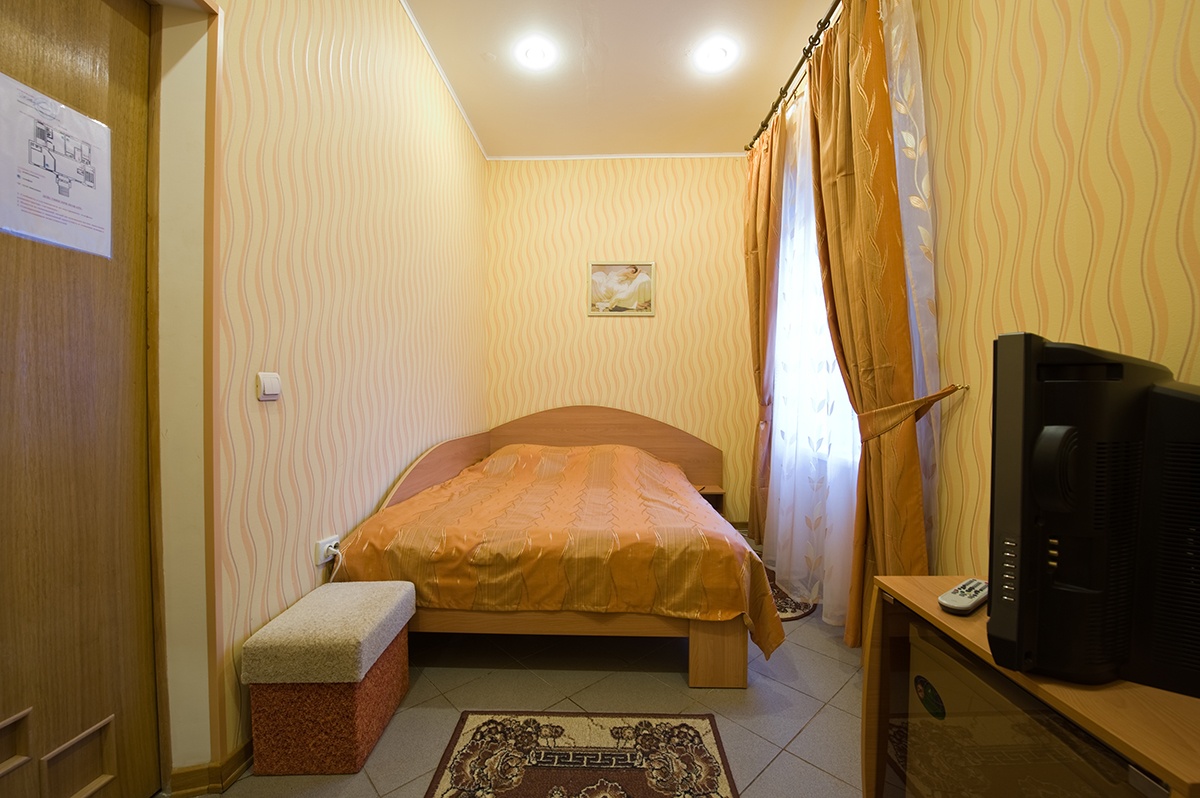 В номере: двуспальная кровать шириной 160-180 см, современная сантехника, телевизор, холодильник с минибаром, мягкая мебель для отдыха (в номерах категорий Люкс, Полулюкс, Улучшенный), проводной Интернет, внутренний телефон, набор туалетных принадлежностей, фен (в номерах категории "люкс"), набор посуды. Во всех номерах полы с подогревом, ковровые покрытия, дополнительное освещение (настенные и прикроватные светильники), часы.