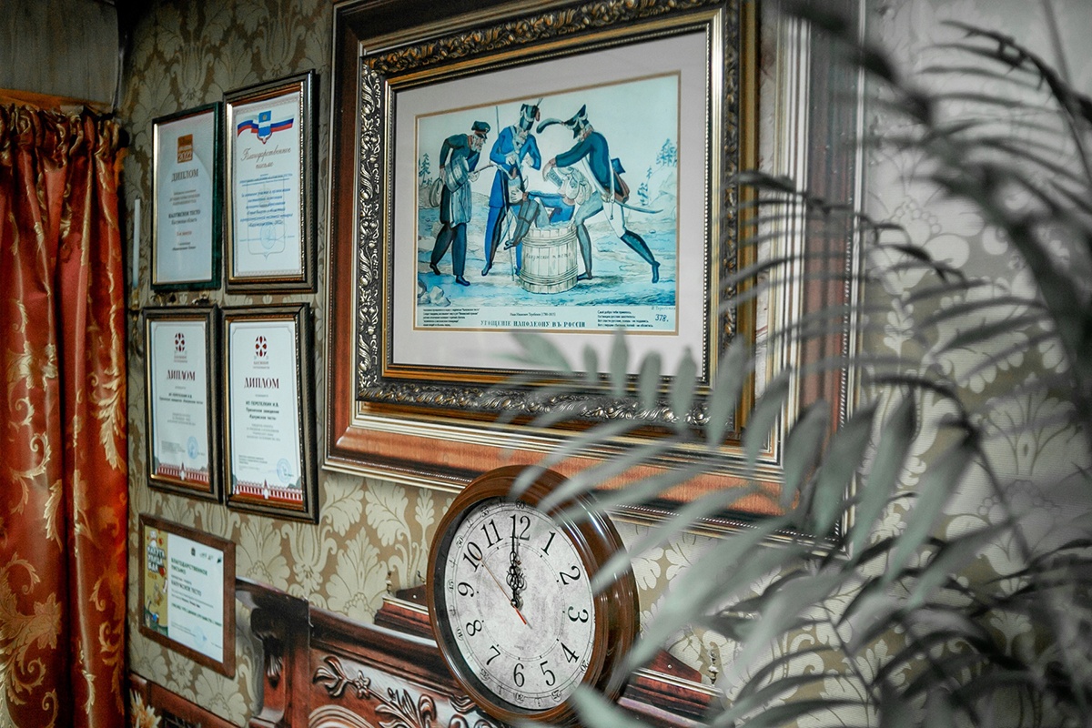 Количество залов: 2 зала, в одном барная стойка и "купеческий интерьер" для фотографий, в другом - большой экран для краеведческих трансляций, здесь же проводятся мастер-классы.