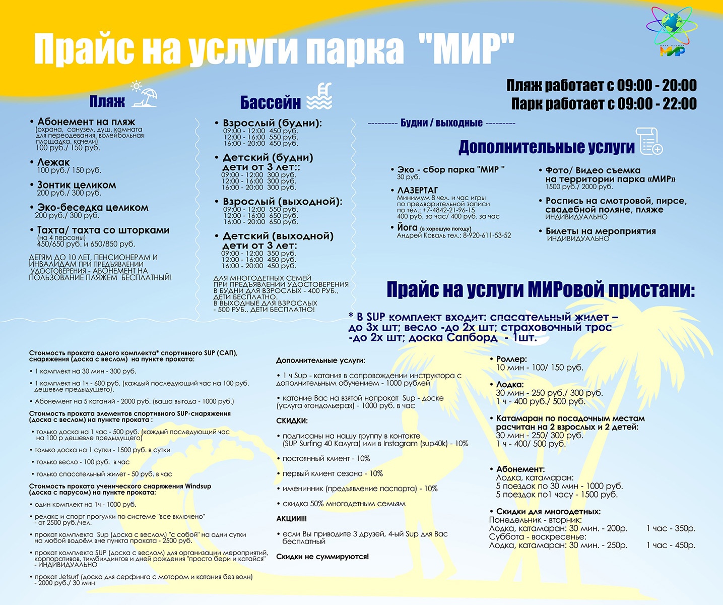 Парк семейного отдыха «МИР», расположенный на набережной Яченского водохранилища, граничит с лодочной станцией и сосновым бором. Пейзажи здесь сказочные: с территории пирса и смотровой можно бесконечно любоваться, укутавшись в плед, алыми закатом и рассветом, которые ярко играют бликами на воде. На возвышении площадки Вью-пойнт видны все берега водоема, лес, городской склон и мост, украшенный уличными огоньками. Романтику поддержат кафе «Атом» с панорамным видом на соседний берег, шатер с lounge-зоной, ротонда, прозрачный купол для проведения мероприятий с выходом на берег.