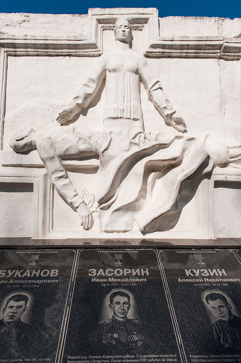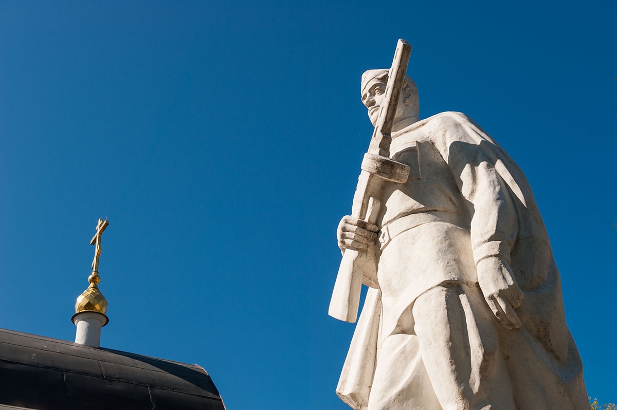 В правой части площади Героев Козельска расположен все тот же мемориальный комплекс "Скорбящая мать" и Вечный огонь.