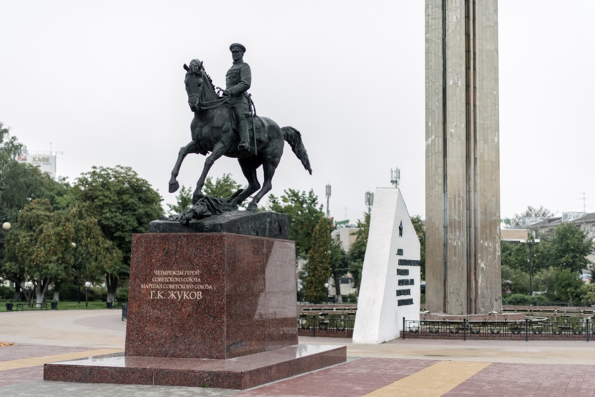 Трудно представить, что на месте площади Победы в Калуге когда-то был небольшой пруд. Сейчас здесь устроен величественный мемориальный комплекс в честь советских воинов и калужан, павших в боях за Калугу в 1941 году, пользующийся у калужан особой заботой. За годы войны Калужская область дала советской армии более 100 тысяч воинов.