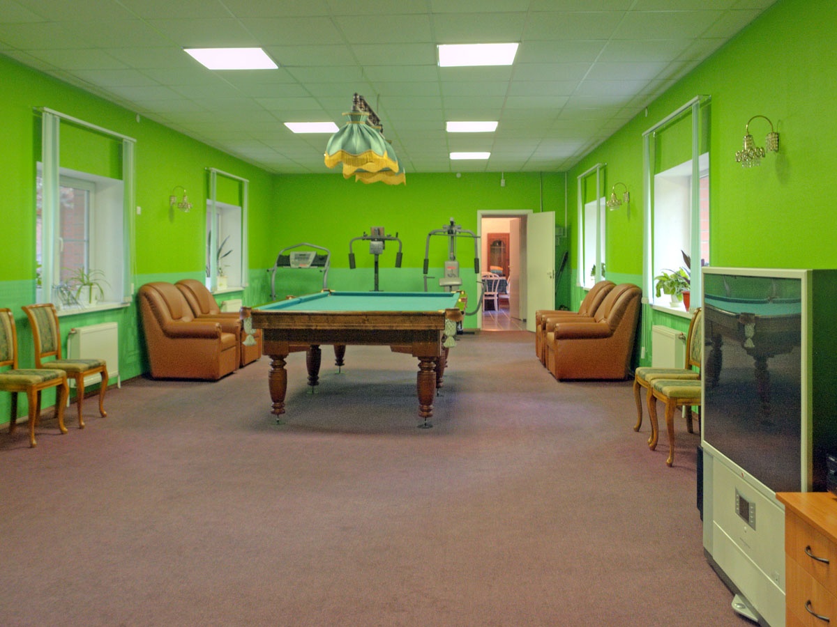 - Шестиместный VIP-коттедж (кухня, гостиная, 3 спальни, комната отдыха с русским бильярдом, тренажерами и домашним кинотеатром, спутниковое телевидение, теплый переход в сауну и бассейн, крытый мангал).