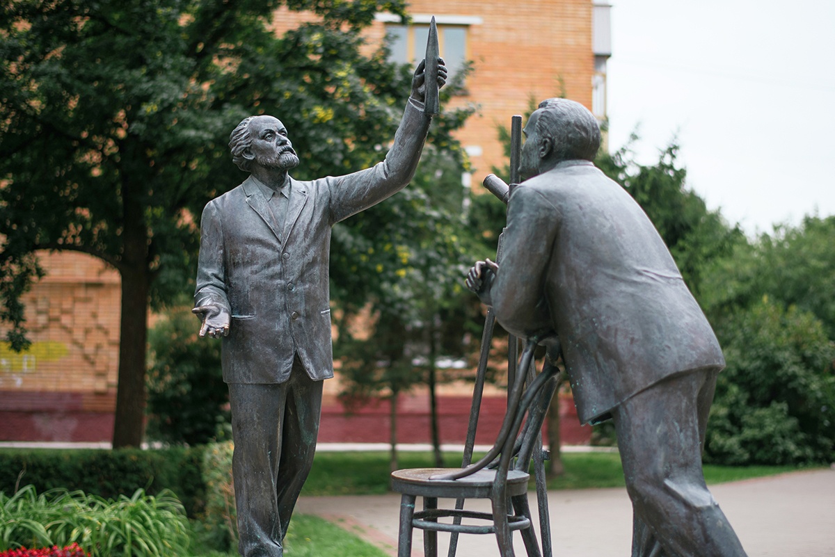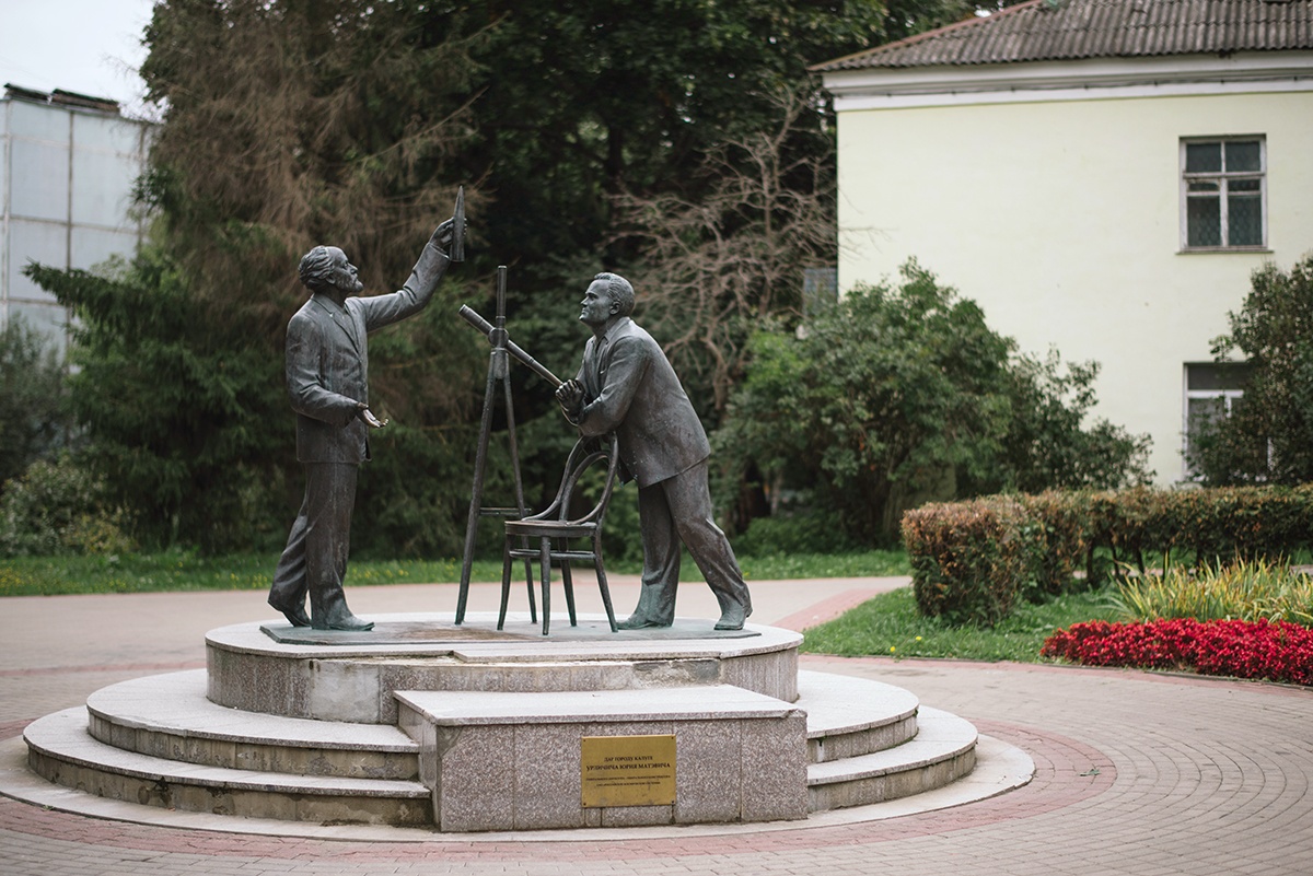 В колыбели космонавтики, где произошло важное для истории событие, встреча Циолковского и Королёва не вызывает сомнений хотя бы потому, что улицы, названные в честь основателей теоретической и практической космонавтики, действительно пересекаются. В 2011 году, накануне 50-летия первого полета человека в космос, встречу закрепили окончательно. В небольшом сквере на улице Королёва была установлена скульптурная композиция, изображающая как бы творческий тандем двух технических гениев, Циолковского и Королёва, в едином стремлении - покорить космос. «Константин Эдуардович не просто передаёт эстафету духовных знаний Сергею Павловичу. Их взоры устремлены вверх на барельеф Гагарина, который помещён на следе этой ракеты», - поделился деталями проекта автор композиции скульптор Алексей Леонов.