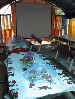 Для отдыха в дружной компании и корпоративных вечеринок поставлен большой шатер с длинными столами, экраном, видеопроектором и баром, мангалом. Площадь - 50 кв.м., на 38 человек. Пол - тротуарная плитка.
