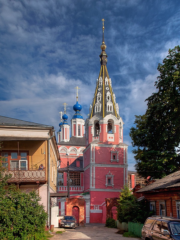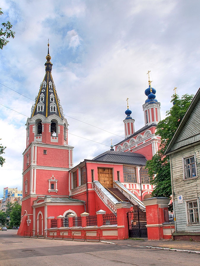 Двухэтажный пятиглавый каменный храм с шатровой колокольней издалека обращает на себя внимание стройностью пропорций и богатыми архитектурными деталями. Окончание постройки каменного храма относится к 1701 году. По преданию, храм был построен Иваном Коробовым - сыном купца Кирилла Ивановича Коробова, чьи палаты находятся неподалеку от храма. Название храма связано с топографическими особенностями города — слово «верх» на местном крестьянском наречии означало овраг, следовательно, прибавление «за верхом» означает «за оврагом» (речь идет о Березуйском овраге).
