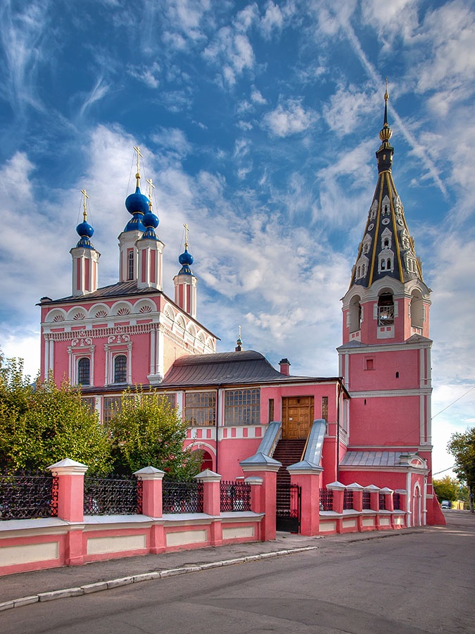 Храм выполнен в стиле построек времен царя Алексея Михайловича, или в стиле "московского барокко". Корпус храма и наружная отделка сохранились почти полностью. Верхний храм имеет всего один придел - во имя Воздвижения Креста Господня. В нижнем этаже три придела: главный - во имя великомученика Георгия Победоносца, южный - во имя иконы Божией Матери "Утоли моя печали" и северный - во имя Иоанна Предтечи.