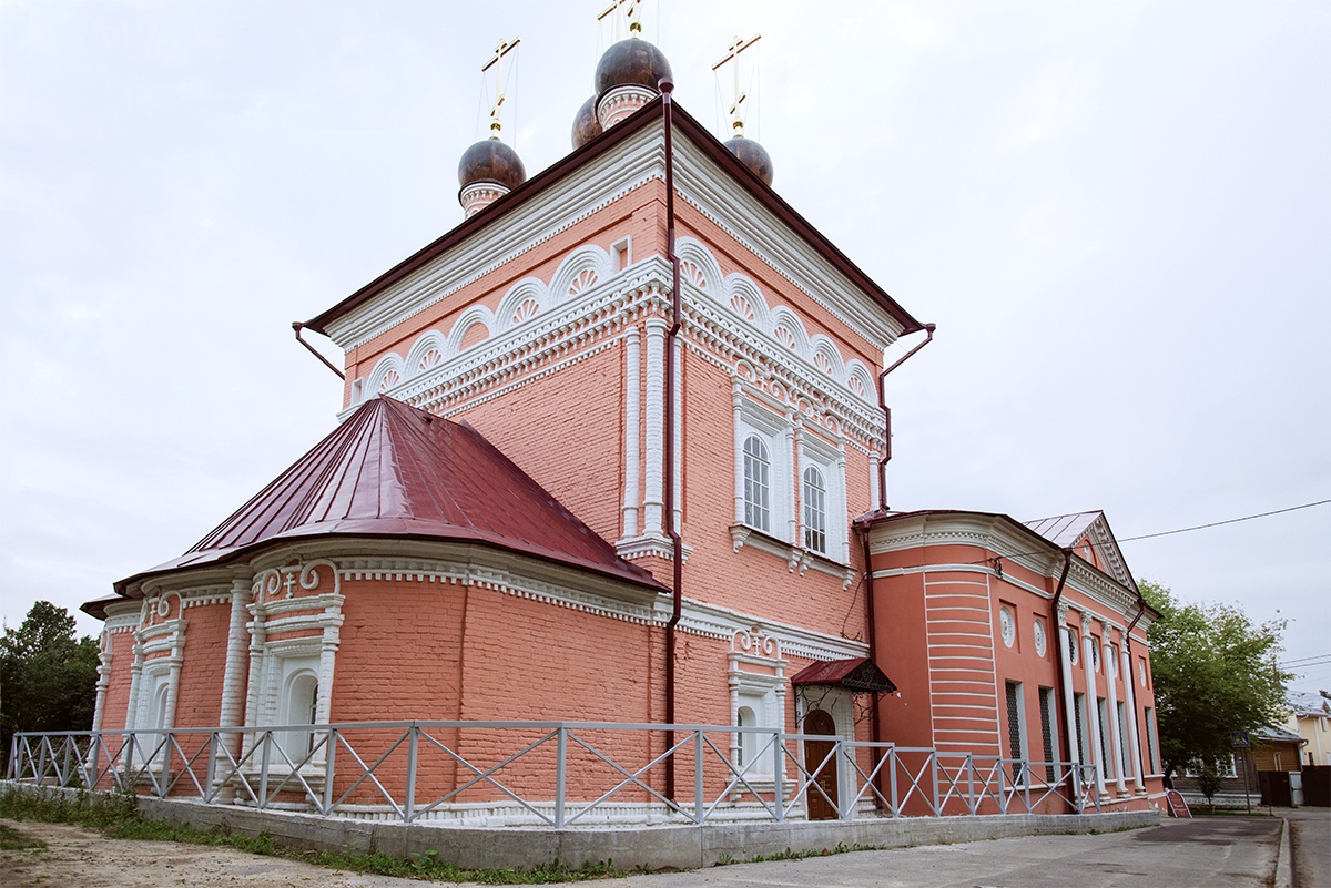 Трапезная часть храма более поздней постройки имеет фронтоны, края которых испещрены зубцами. Под фронтоном пилястры. Колокольня храма была четырехъярусная, постепенно суживающаяся кверху; второй и третий ярус восьмигранные, с дорическими колоннами по углам. Вход в храм украшен портиком на парных колоннах с коринфской капителью и с зубчиками по краям фронтона.