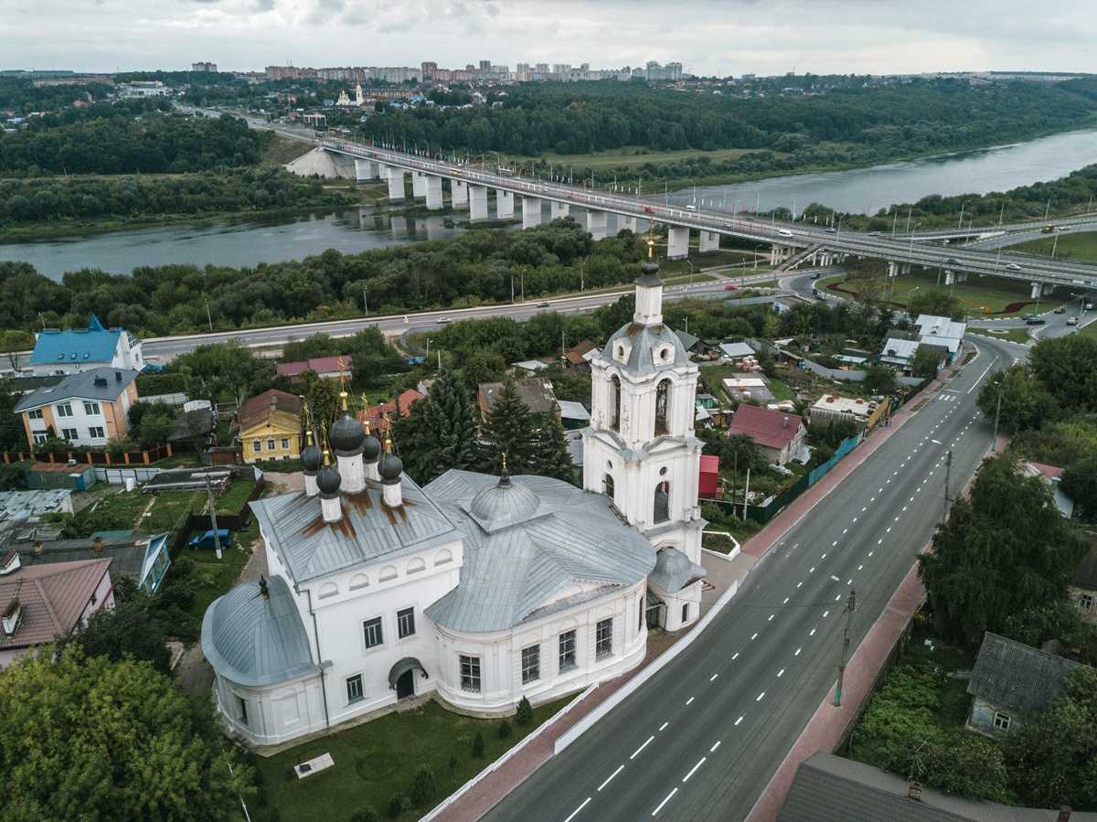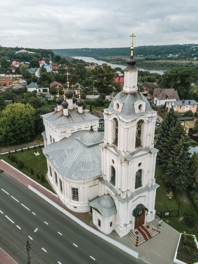 Храм Преображения Господня, «что за верхом», стоит на самом въезде в Калугу — на старой Смоленской дороге, в старинном районе города, который по месту своего расположения на холме за Березуйским оврагом получил название «завершье».