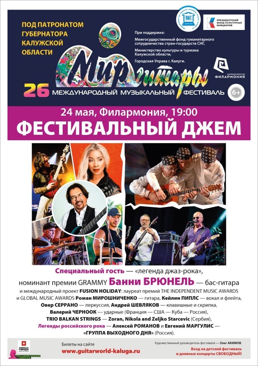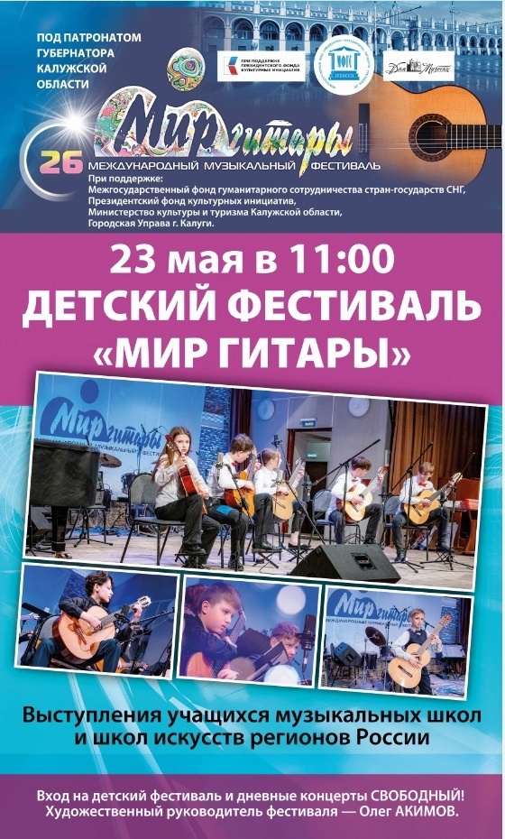 День, Дом музыки – XII Калужский областной открытый детский фестиваль «Мир гитары» с участием учащихся и педагогов музыкальных школ. Вход свободный. Проводится при поддержке Президентского фонда культурных инициатив.