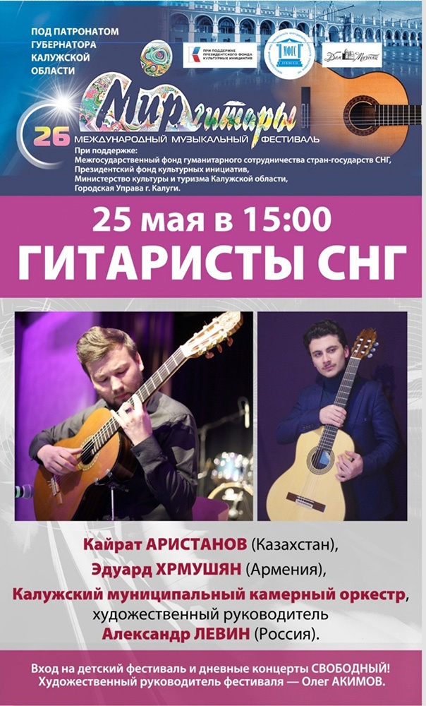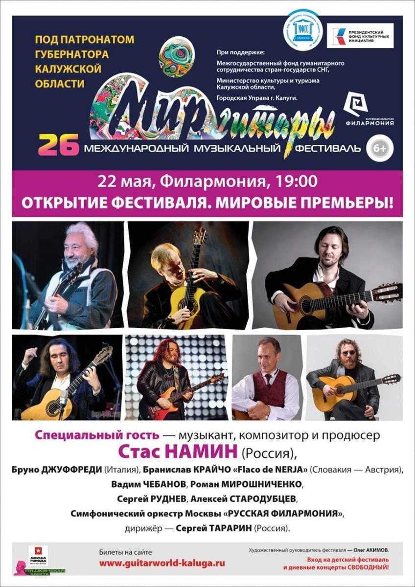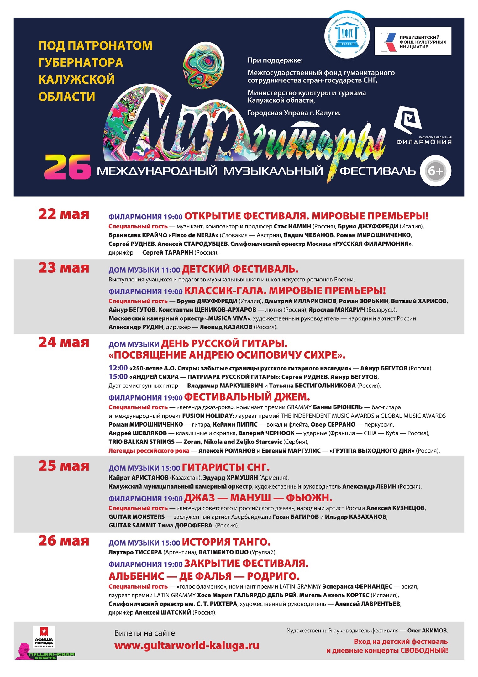В настоящее время «Мир гитары» является самым масштабным фестивалем гитарной музыки на постсоветском пространстве, в Европе и одним из крупнейших в мире. В музыкальном форуме принимают участие ведущие солисты и коллективы, композиторы и дирижёры из России, стран СНГ и дальнего зарубежья. В рамках 26-го «Мира гитары» на калужскую сцену выйдут талантливые музыканты СНГ (Азербайджан, Армения, Беларусь, Казахстан) и дальнего зарубежья (Австрия, Италия, Испания, Куба, Словения, США, Уругвай, Франция, Сербия, Аргентина). Один из крупнейших гитарных форумов планеты проводится при поддержке Межгосударственного фонда гуманитарного сотрудничества государств-участников СНГ (МФГС). Концерты в рамках 26-го фестиваля пройдут также во Владимире, Москве, Обнинске и Туле.