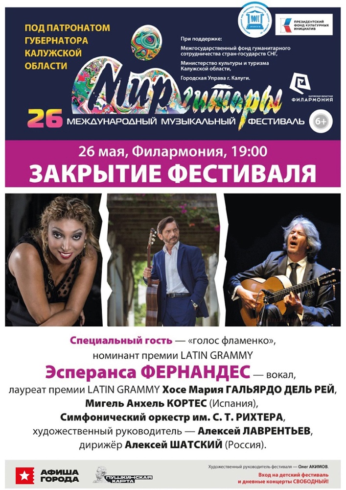 Вечер, Филармония – Закрытие фестиваля. Альбенис - де Фалья - Родриго. Выступают лауреаты и номинанты престижной музыкальной премии Latin Grammy. В Калугу приедут гитаристы из Испании Хосе Мария Гальярдо дель Рей и Мигель Анхель Кортес.