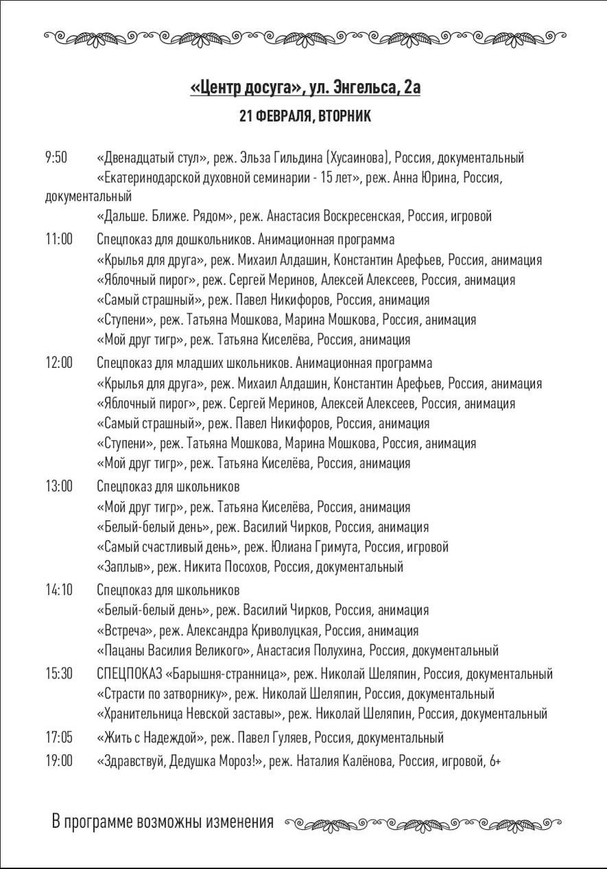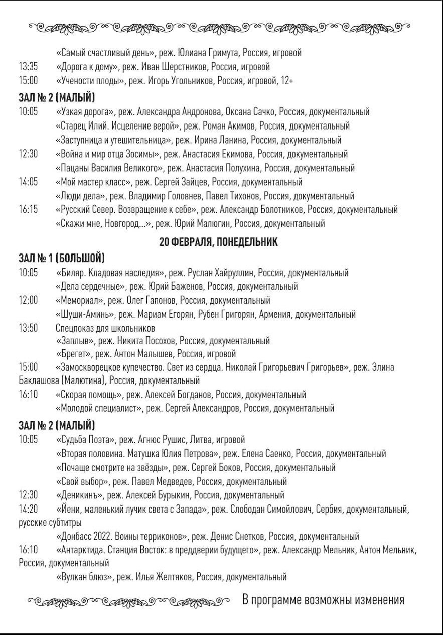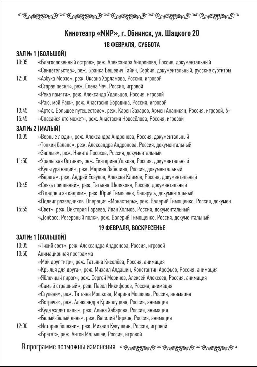 18, 19, 20 февраля с 10:00 до 18:00 — показы фильмов конкурсной и внеконкурсной программы, Кинотеатр «Мир» (Обнинск, ул. Шацкого, 20).