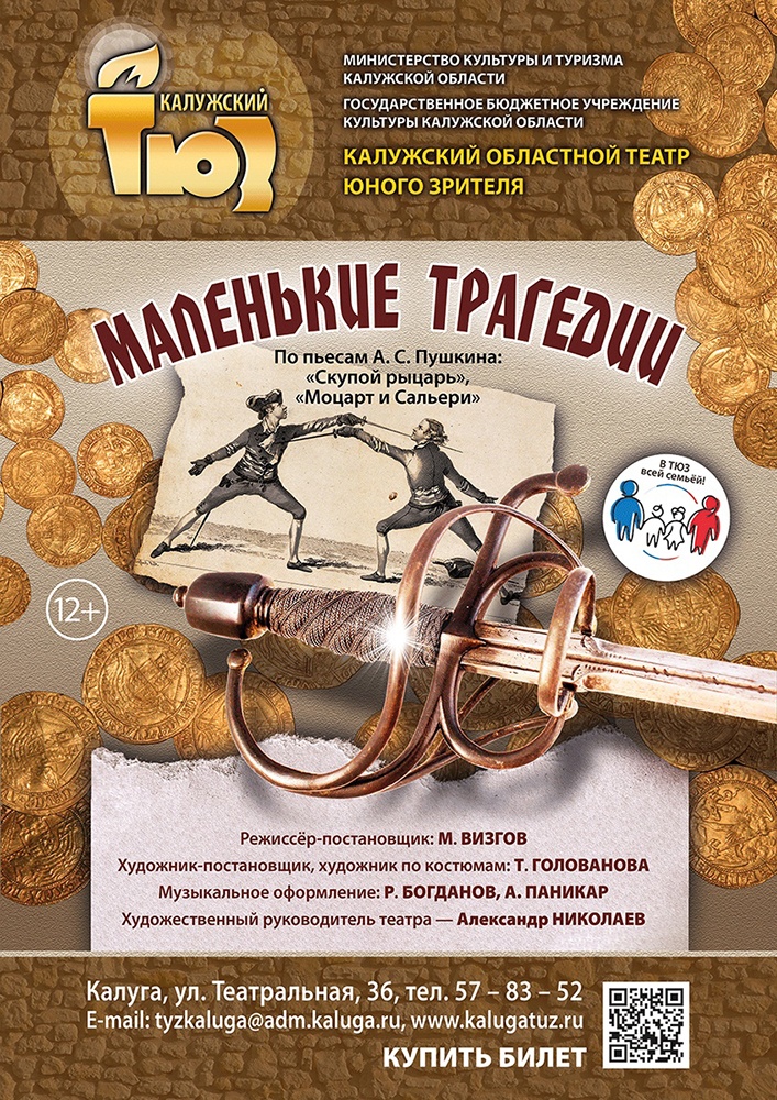 К 225-летию со дня рождения Александра Сергеевича Пушкина ТЮЗ готовит спектакль «Маленькие трагедии». Премьера состоится 3 мая в 18:30. В основу спектакля лег фрагмент условного цикла А.С. Пушкина, состоящего из одноактных пьес в стихах, действие которых происходит в Западной Европе в разные времена. Постановка Михаила Визгова, вобравшая в себя сюжеты «Моцарта и Сальери» и «Скупого рыцаря», посвящена человеческим страстям - тем самым, что поглощают нас целиком, подчиняя себе все мысли и чувства. Каждый главный герой одержим такой страстью - будь то стяжание сокровищ, творчество или жажда бессмертия. Каждый из них - добровольный раб своей страсти, которому мало подчинить ей свое личное бытие, он хочет подчинить ей мир...