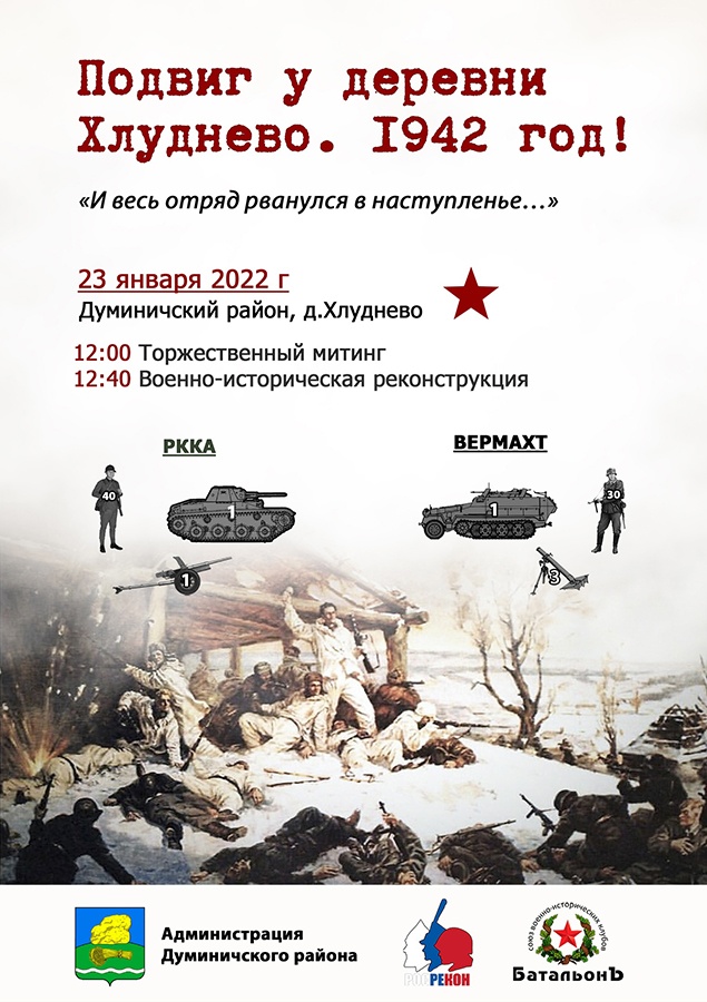 23 января в честь 80-летия подвига отряда ОМСБОН у деревни Хлуднево Думиничского района военно-исторический клуб "Батальон" и районная администрация организуют реконструкцию боя 1942 года. Мероприятие начнется в 12 часов с митинга.