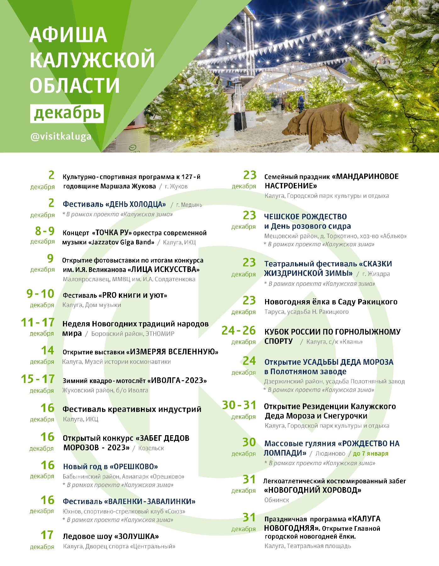 - 23 декабря – Театральный фестиваль «Сказки Жиздринской зимы». г. Жиздра. В рамках проекта "Калужская зима"