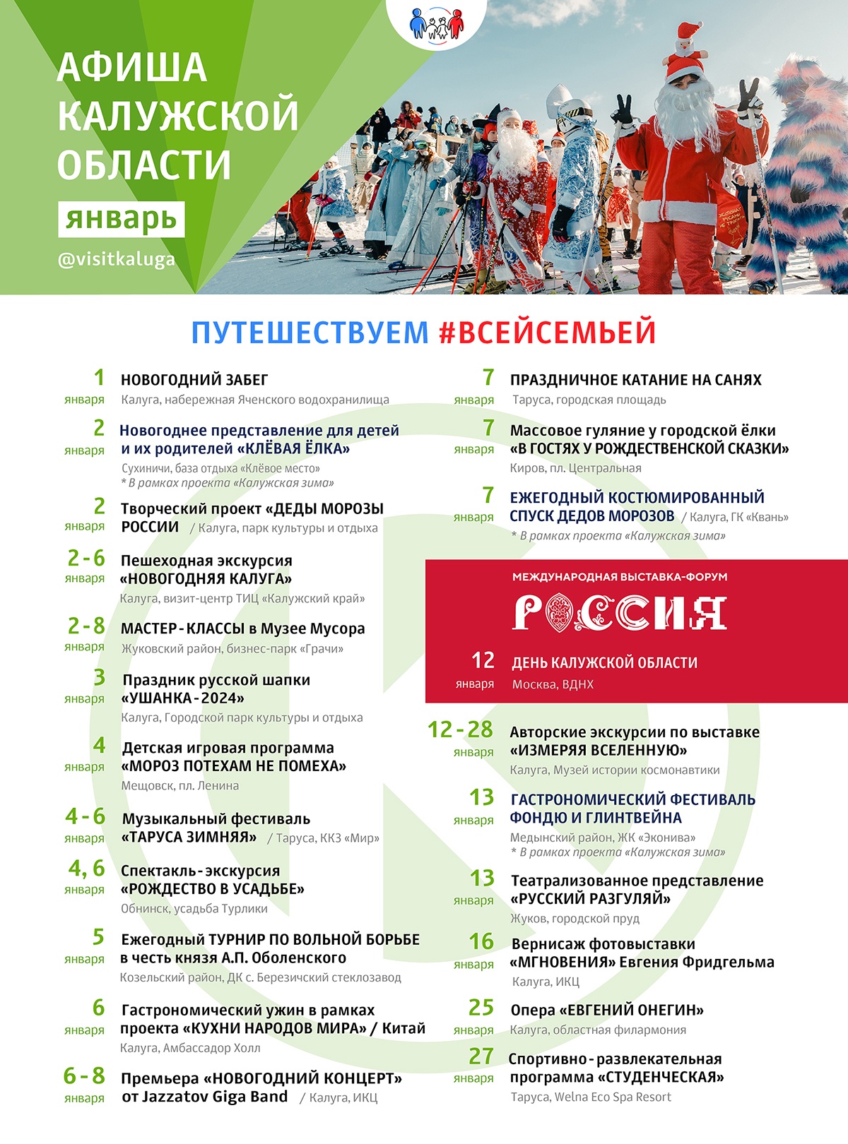 - 7 января – Ежегодный костюмированный спуск Дедов Морозов. Калуга, горнолыжный комплекс «Квань». В рамках проекта "Калужская зима"