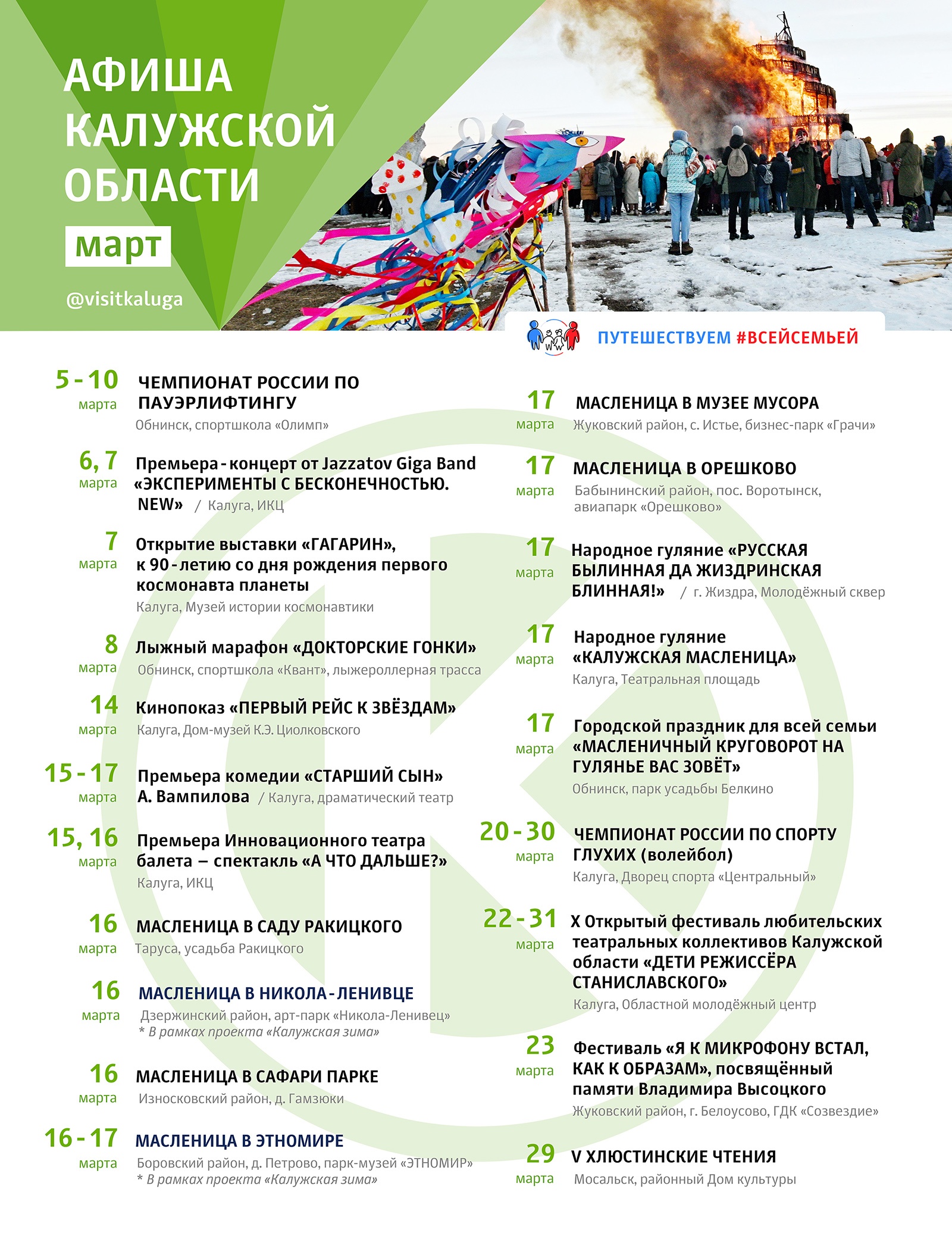 17 марта –Народное гуляние "Калужская Масленица". Калуга, Театральная площадь. Продолжительность программы с 12 до 16 часов. Вход свободный.