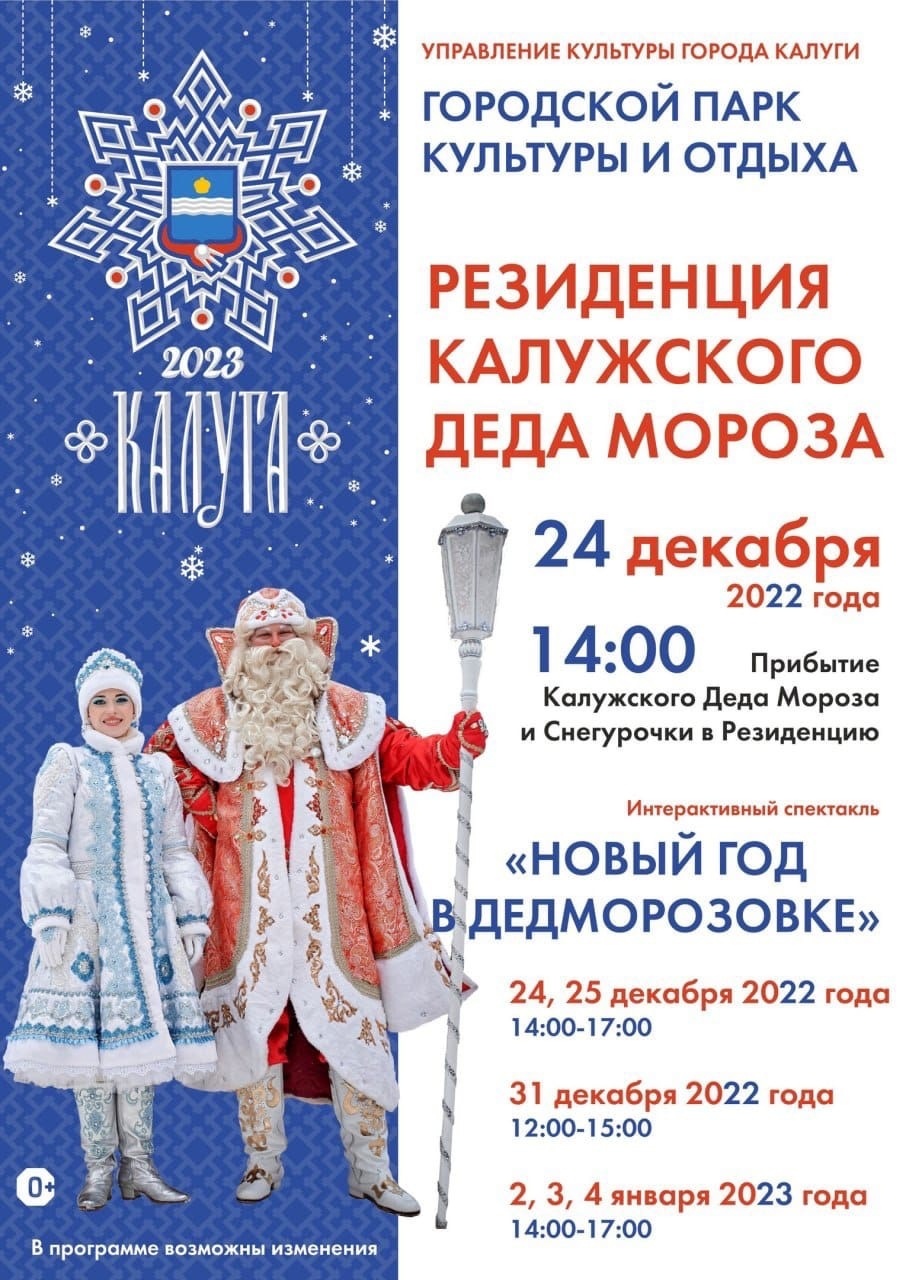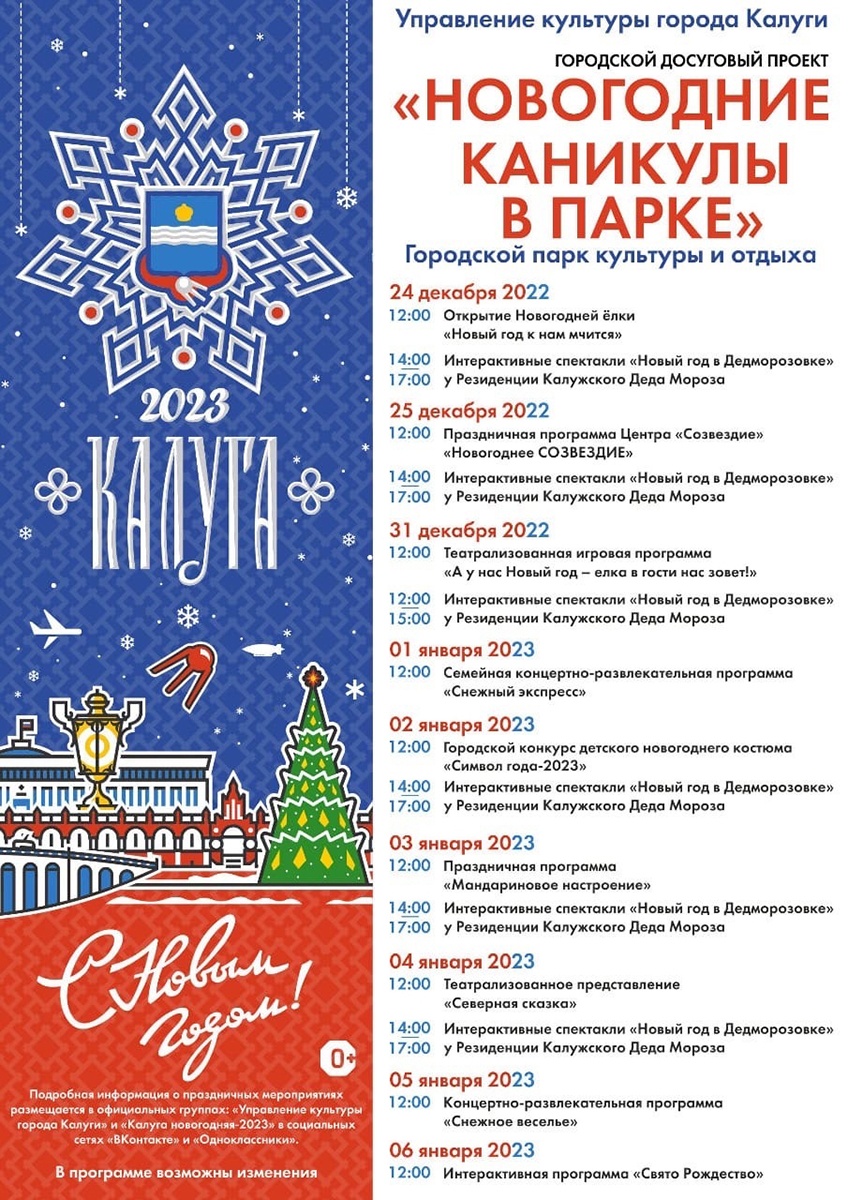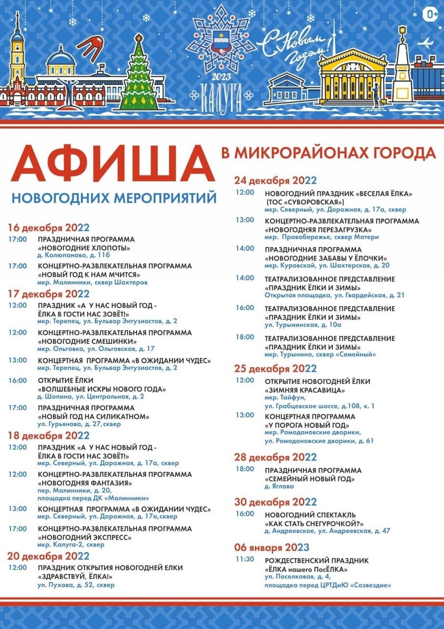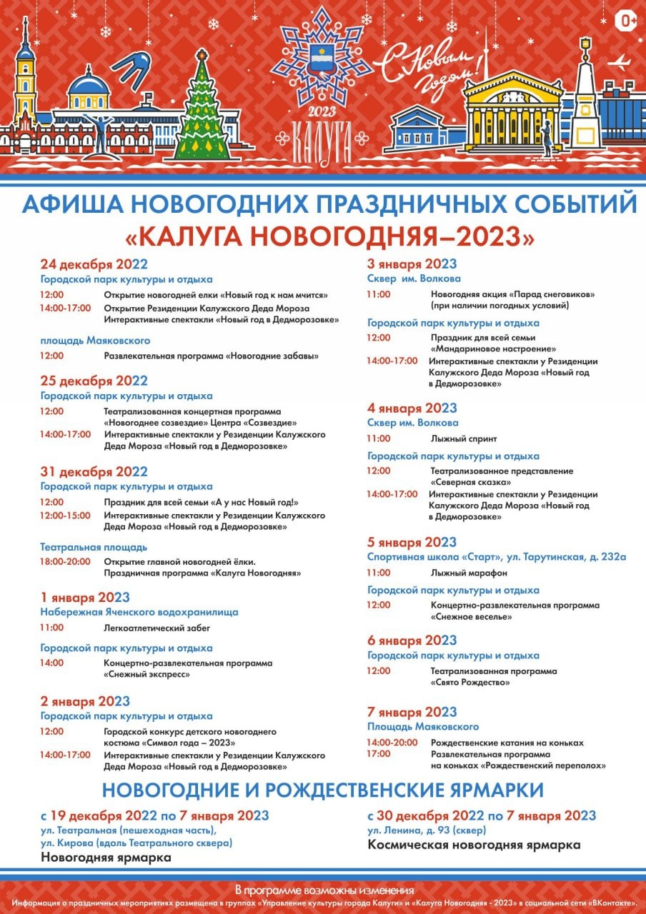 Управление культуры Калуги представило официальную афишу новогодних событий. Всего запланировано 46 общегородских мероприятий: 23 на центральных площадках и 23 в микрорайонах города. В основном задействован центр города: парк культуры и отдыха, Театральная площадь, площадь Старый Торг и сквер имени Волкова. Акцент в этом году сделан на детскую аудиторию и семейный отдых. Калужане смогут посмотреть концертные программы, открытие елки, театрализованные представления и другое.