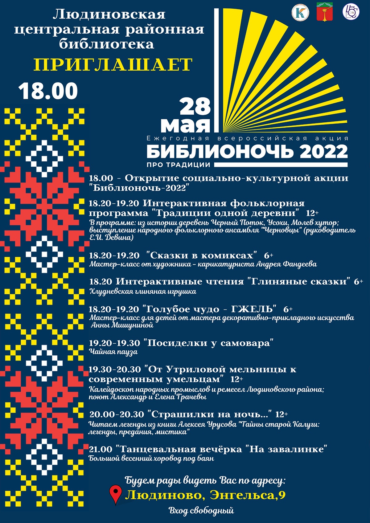 По своей оригинальности привлекает особое внимание программа людиновской библиотеки. Там точно акцию проведут не менее интересно, чем в областном центре. Начало в 18.00, а закончится программа танцами и хороводом.