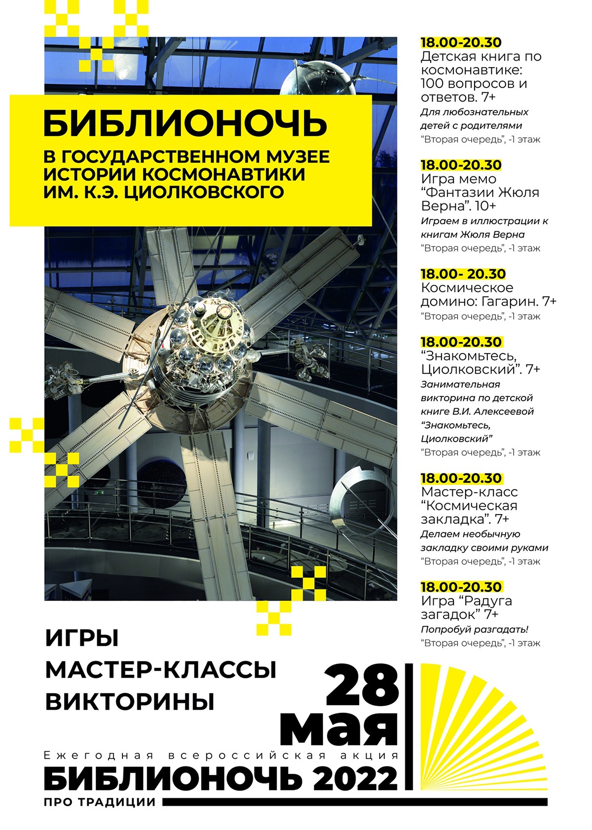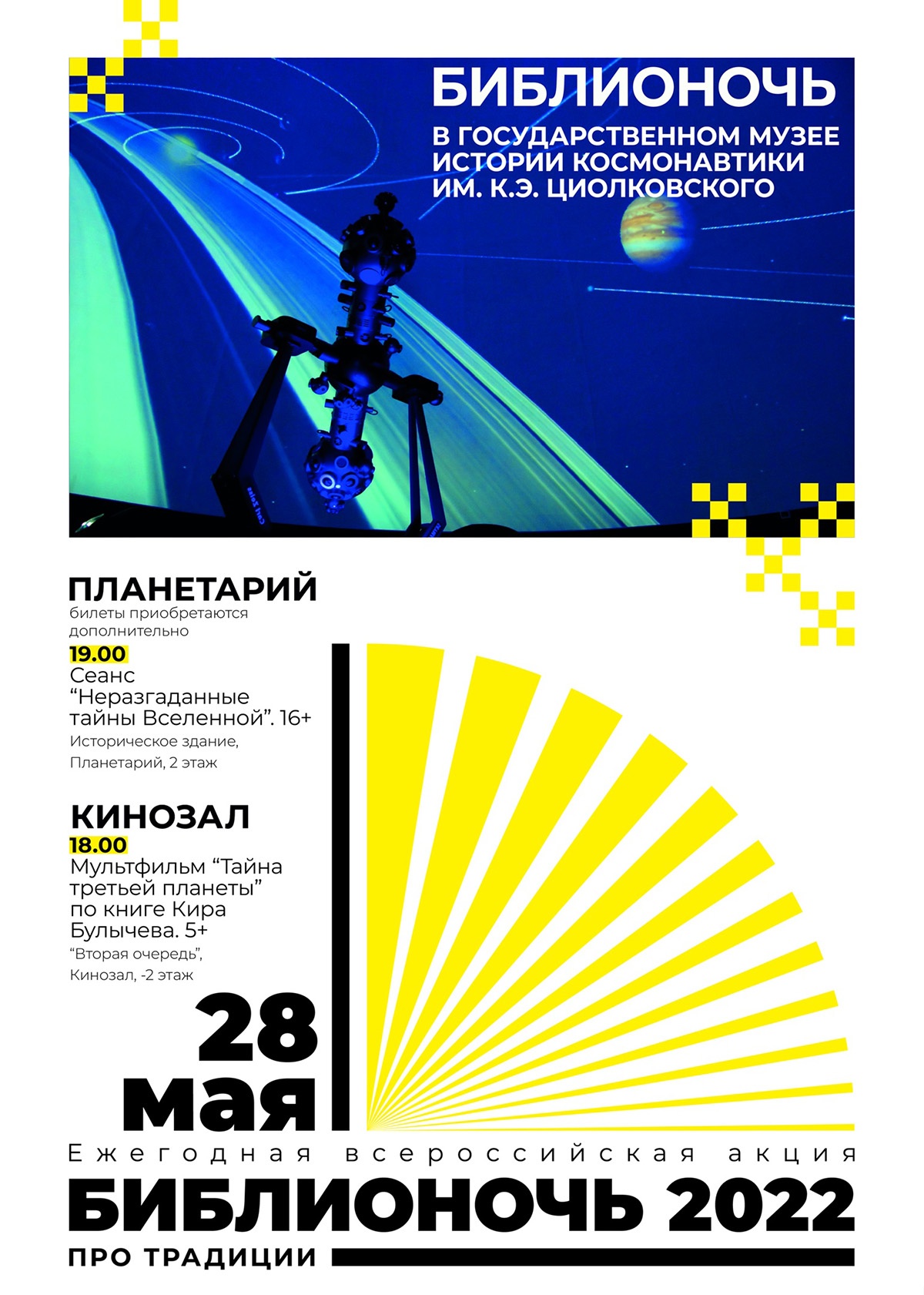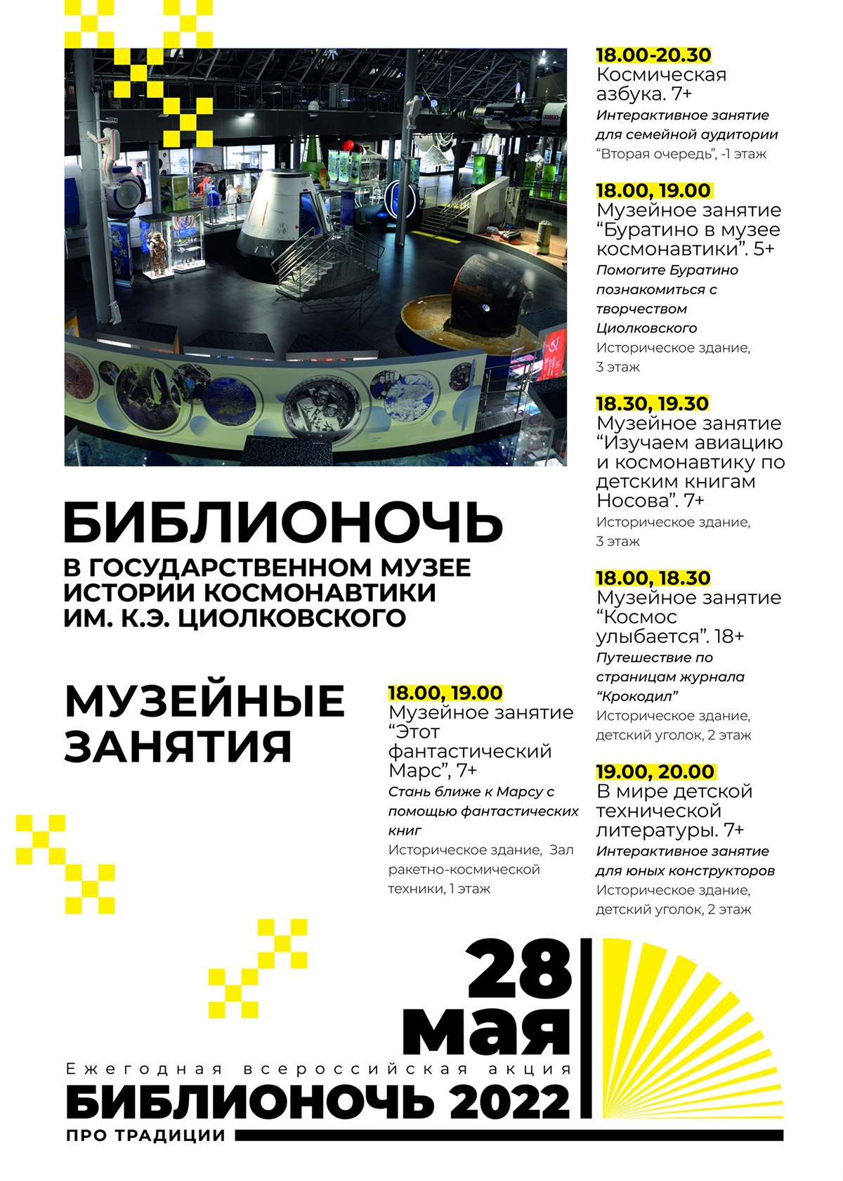 Не первый раз с призывом читать о космосе к библиотекам присоединяется Государственный музей истории космонавтики. Специальная программа подготовлена на 28 мая: творческие мастер-классы, экскурсии и лекции. Музей, его отделы и филиал работают в этот день с 10.00 до 21.00. Стоимость входных билетов в главное здание с 18.00 снижена: для взрослых, пенсионеров и студентов - 200 рублей, остальные категории - бесплатно. Дом-музей К.Э. Циолковского, Дом-музей А.Л. Чижевского, Музей-квартира К.Э. Циолковского в Боровске и Музей профессора Н.Е. Жуковского в Москве принимают посетителей бесплатно.
