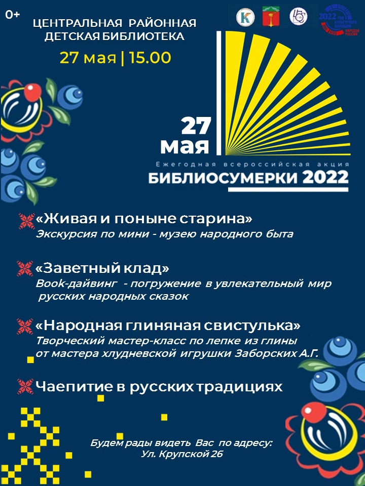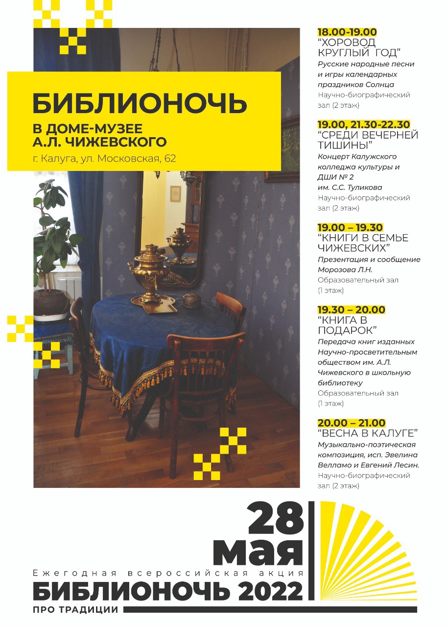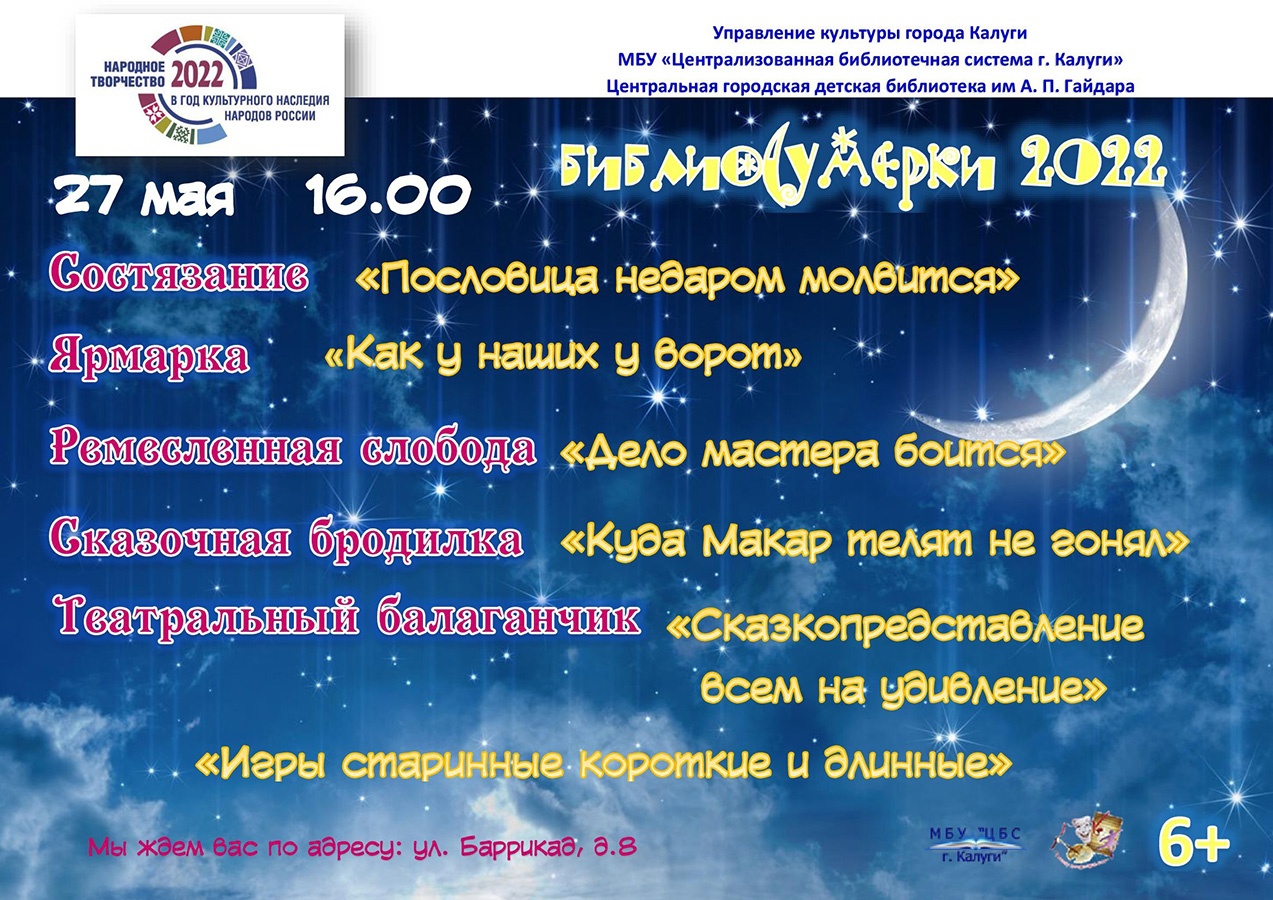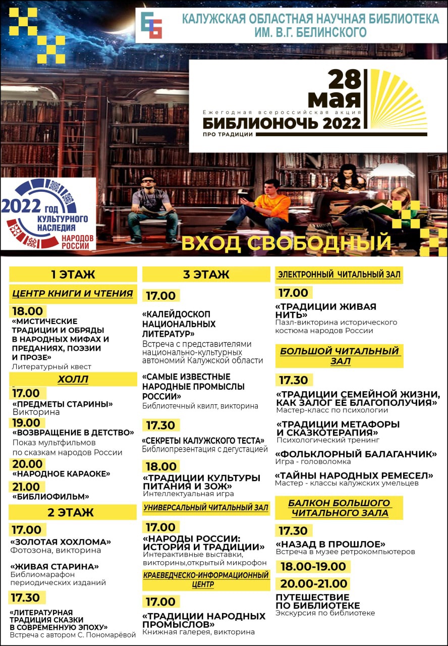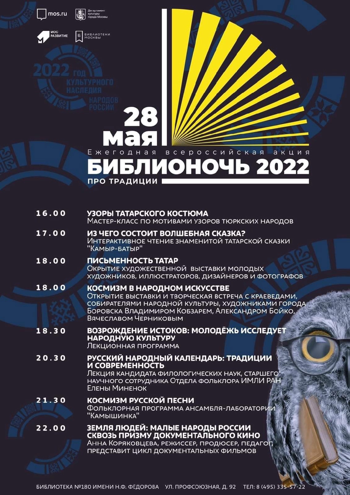 Впервые ежегодная всероссийская акция «Библионочь» следует за «Ночью музеев», а не предшествует ей. В этом году «Библионочь» наступит 28 мая. Так как 2022 год объявлен годом культурного наследия, темой акции становятся Традиции.