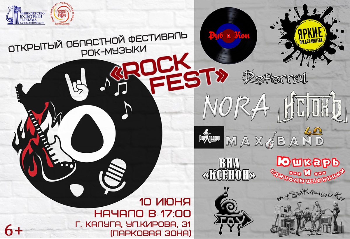 Прекрасная новость для любителей настоящего рока. Во второй раз в Калуге проводится Открытый областной фестиваль рок-музыки «Rock Fest». Опен-эйр у кинотеатра «Центральный» поддержан музеем «Рок-подвал», а это значит, что 10 июня выступят лучшие рок-группы Калужской области и других регионов России, и некоторые из них, кстати, уже отметились на рок-подвальниках у Валентина Черняка. Участники представят авторские композиции и кавер-версии известных песен.